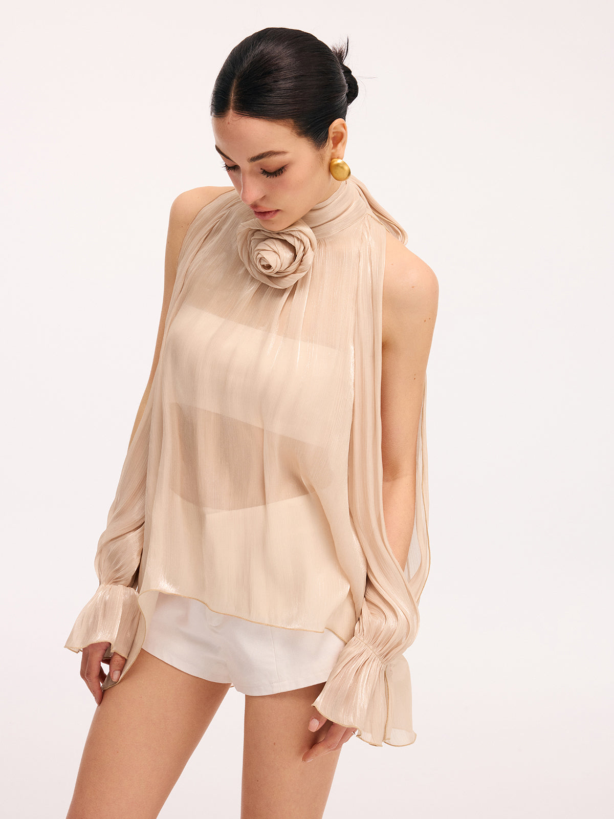 3D Rose Halter Neck Bell Sleeve Sheer Blouse