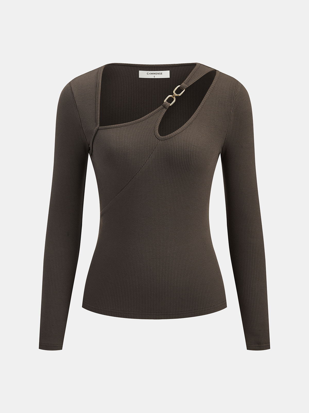 asymmetric,asymmetrical neck,blouses,casual,clothing,coll:blouses_shirts,coll:linen_cotton,coll:tops,corpcore,cotton blends,dark brown,high stretch,in_six_month,long sleeve,metal detail,minegence,no,not_low_sales,oa251121060,regular,slim fit,tops,winter hues,women