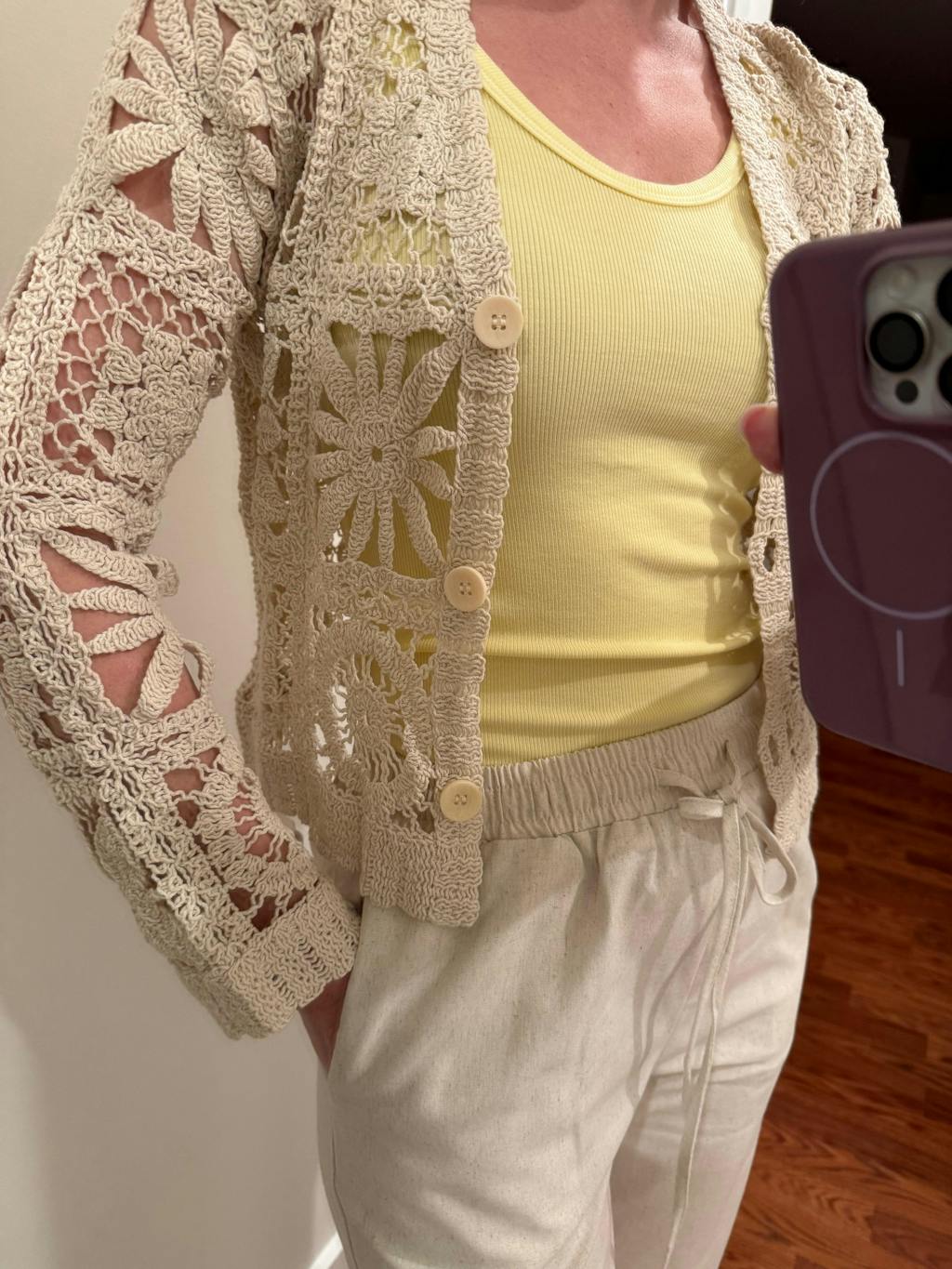 I love this cardigan! Quality is great, it looks super cute with beige linen pants or jeans and just tank top underneath. Get size down if you want it more fitted.