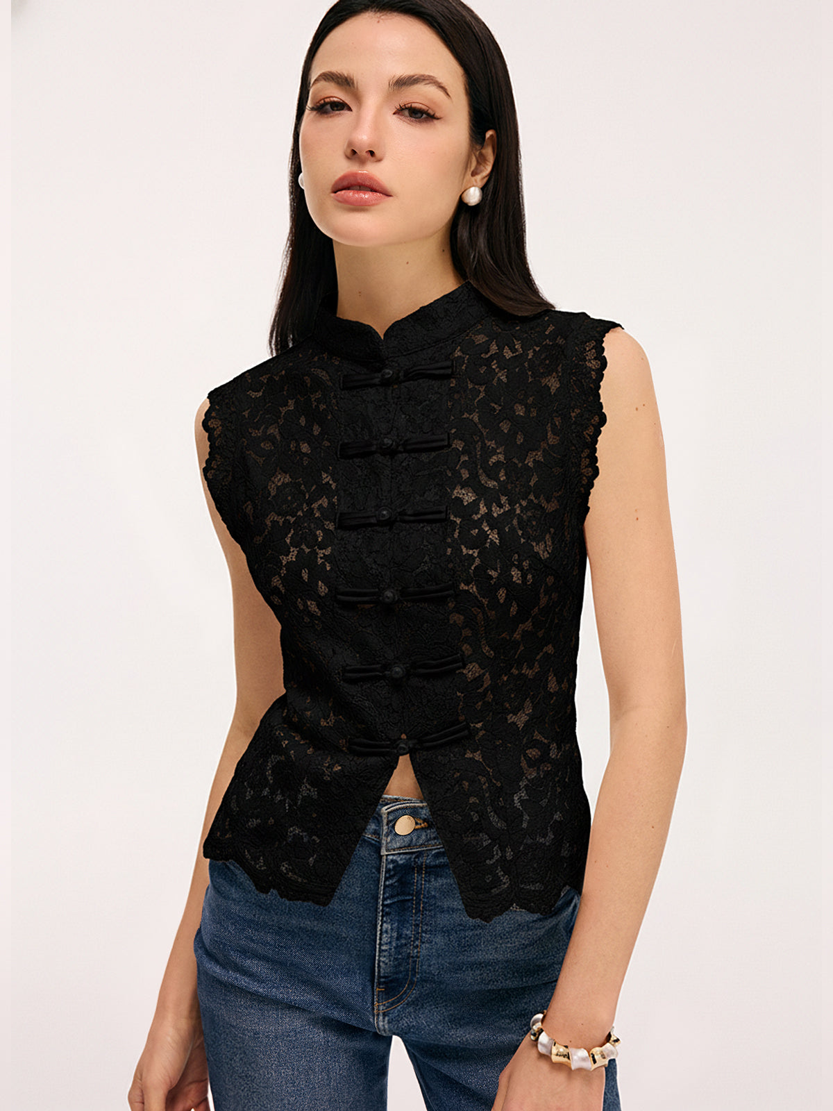 Lace Mandarin Collar Pearl Button Sleeveless Top