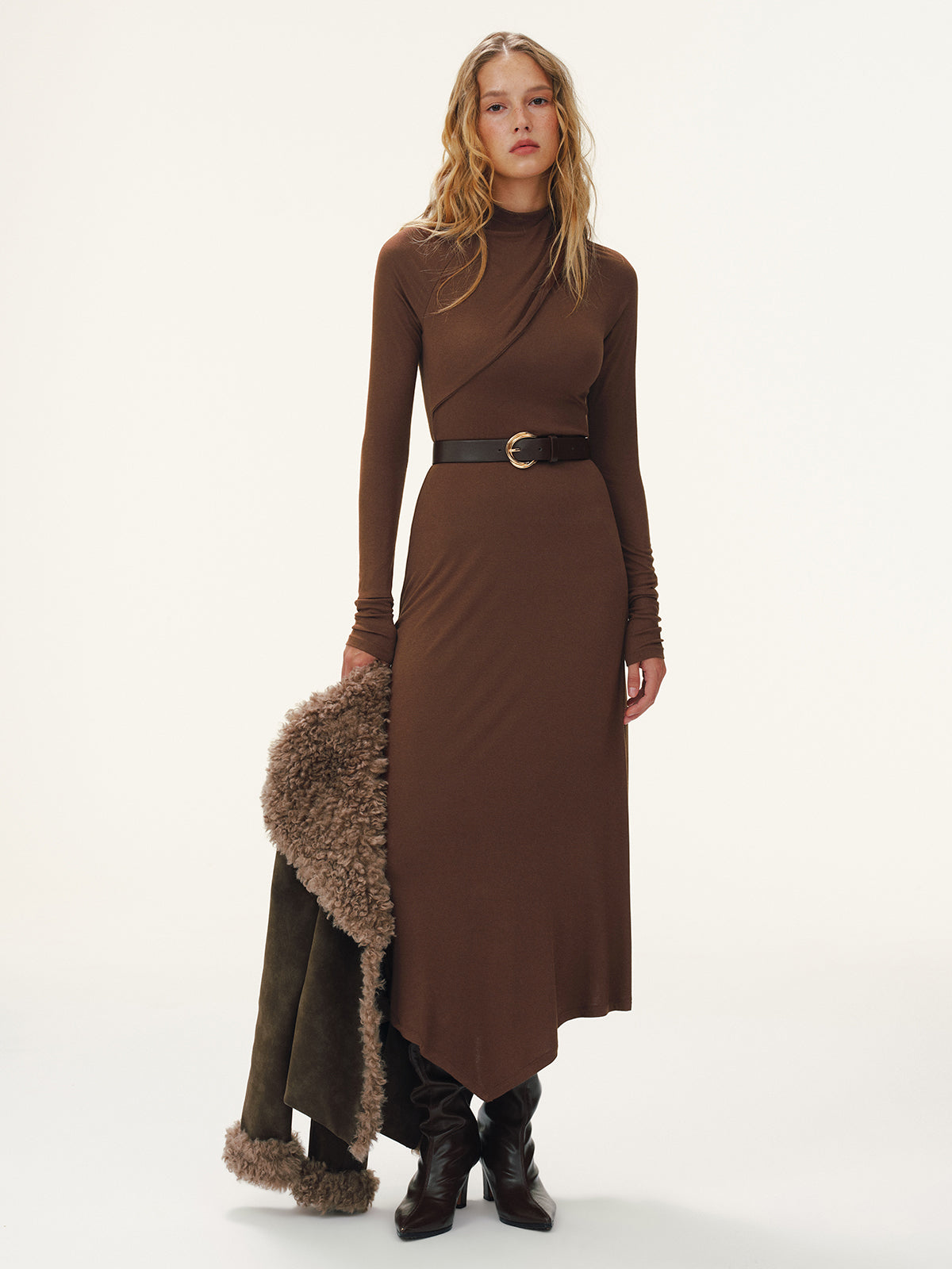 a-none,belted,casual,clothing,coll:dresses,corpcore,dark brown,dresses,fall,high neck,in_six_month,inner sample,jersey,long sleeve,maxi,medium stretch,minegence,no,not_low_sales,oa250911138,photo_model,regular,regular fit,winter,women