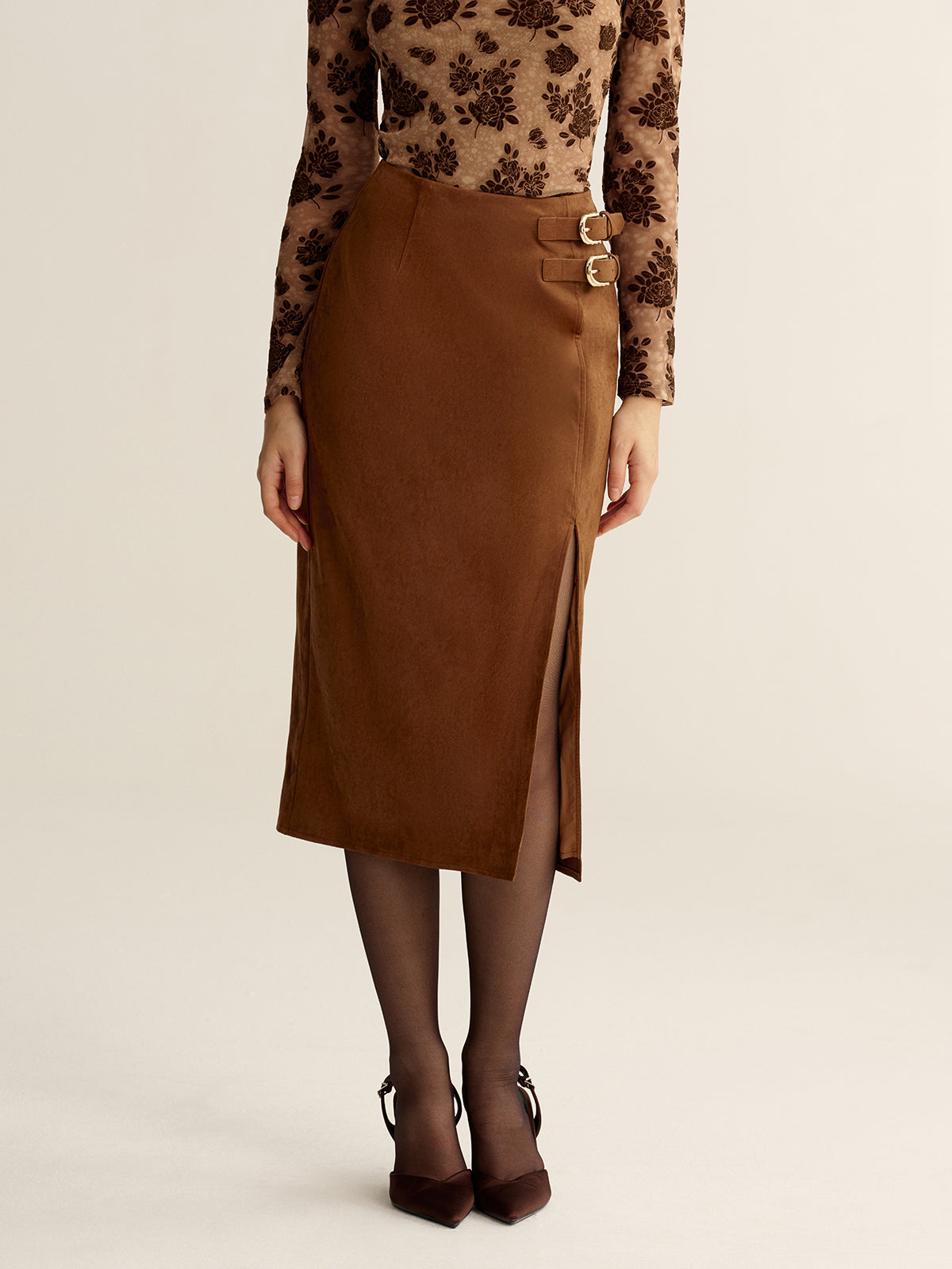 Buckle Detail Side Slit Suede Effect Maxi Skirt