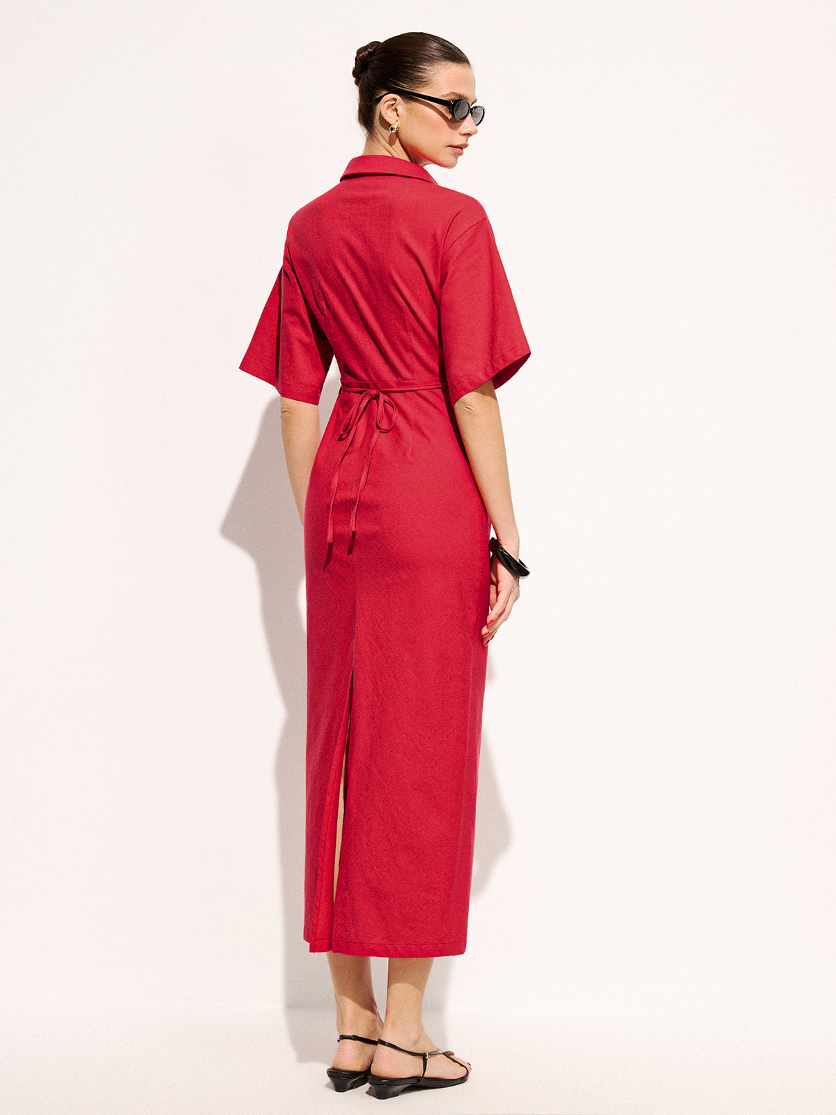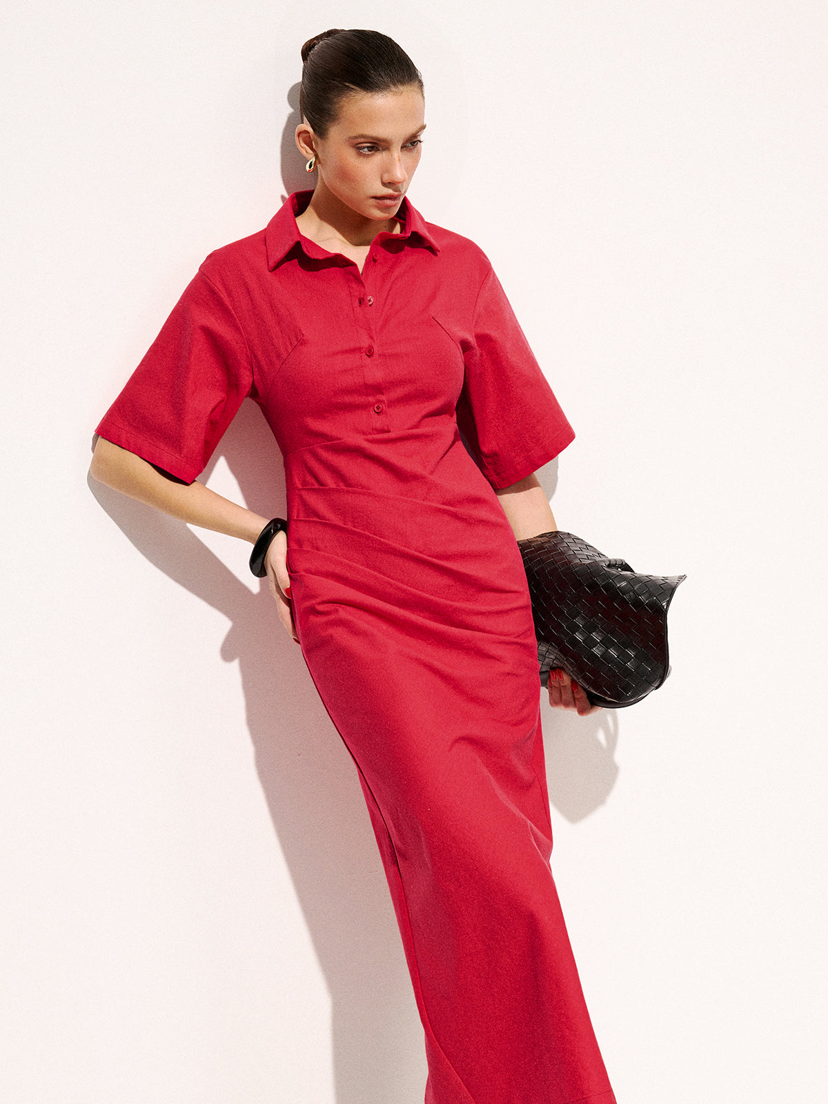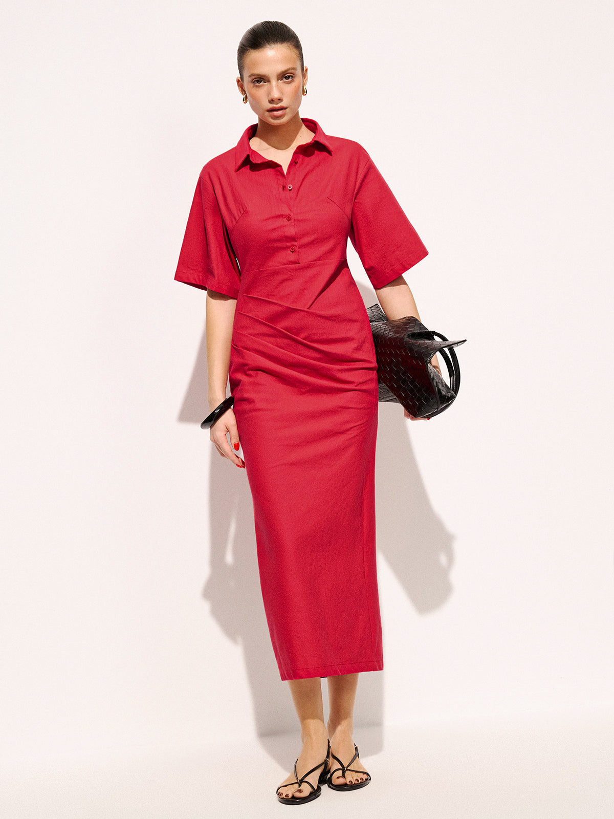 asymmetric,clothing,coll:dresses,coll:linen_cotton,coll:vacation,coll:weekend_getaway,collar,cotton,date,dresses,in_six_month,maxi,minegence,no,not_low_sales,oa251224056,photo_model,pleated,red,regular,regular fit,short sleeve,slight stretch,summer hues,vacation,women
