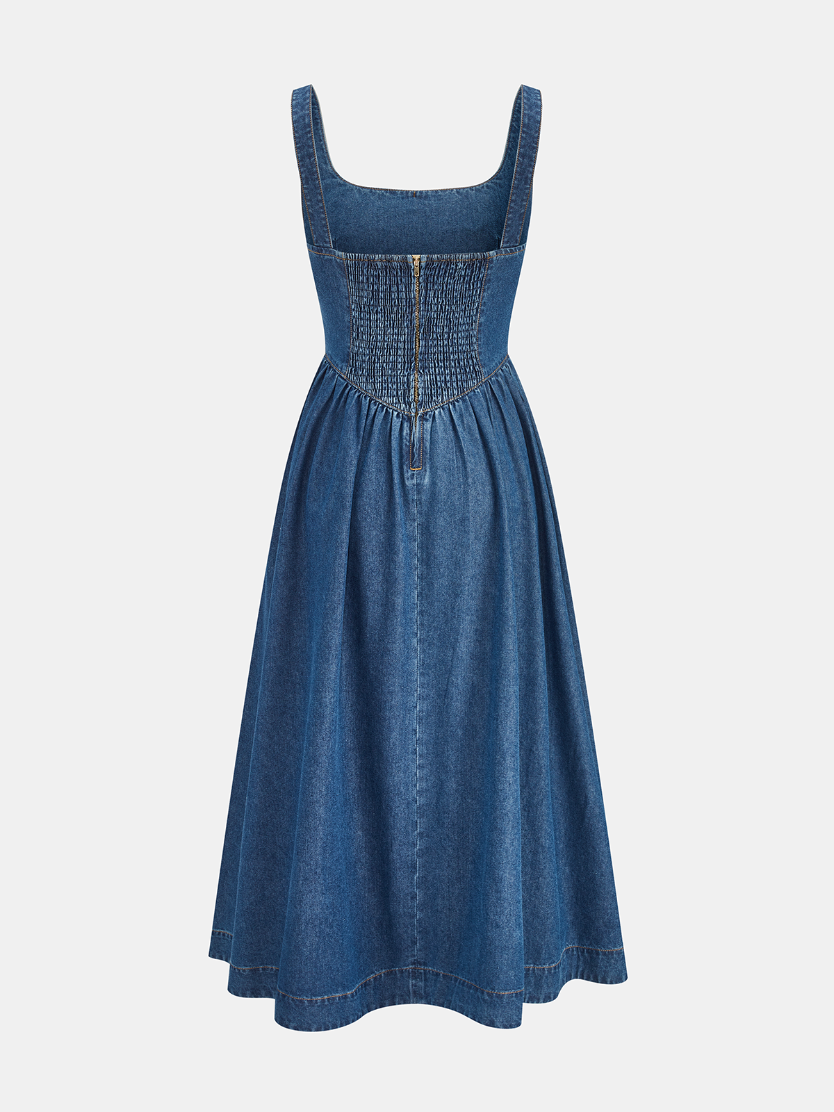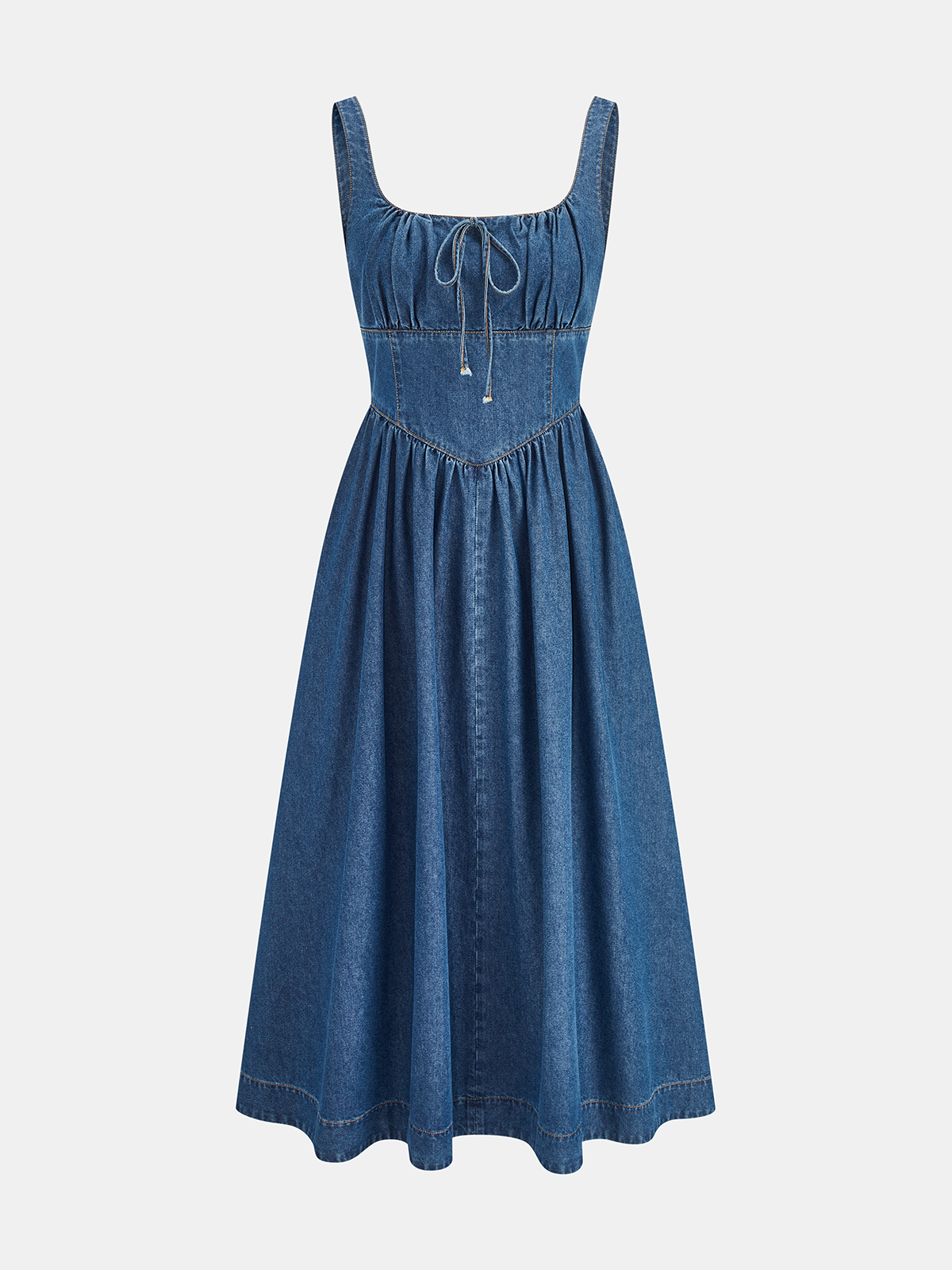 blue,casual,clothing,coll:denim,coll:dresses,collarless,date,denim,dresses,in_six_month,midi,minegence,no,not_low_sales,oa260115015,photo_ai,regular,regular fit,ribbon detail,ruched,sleeveless,slight stretch,women