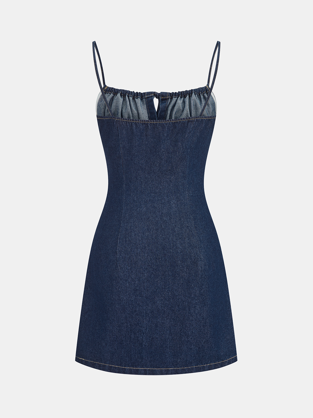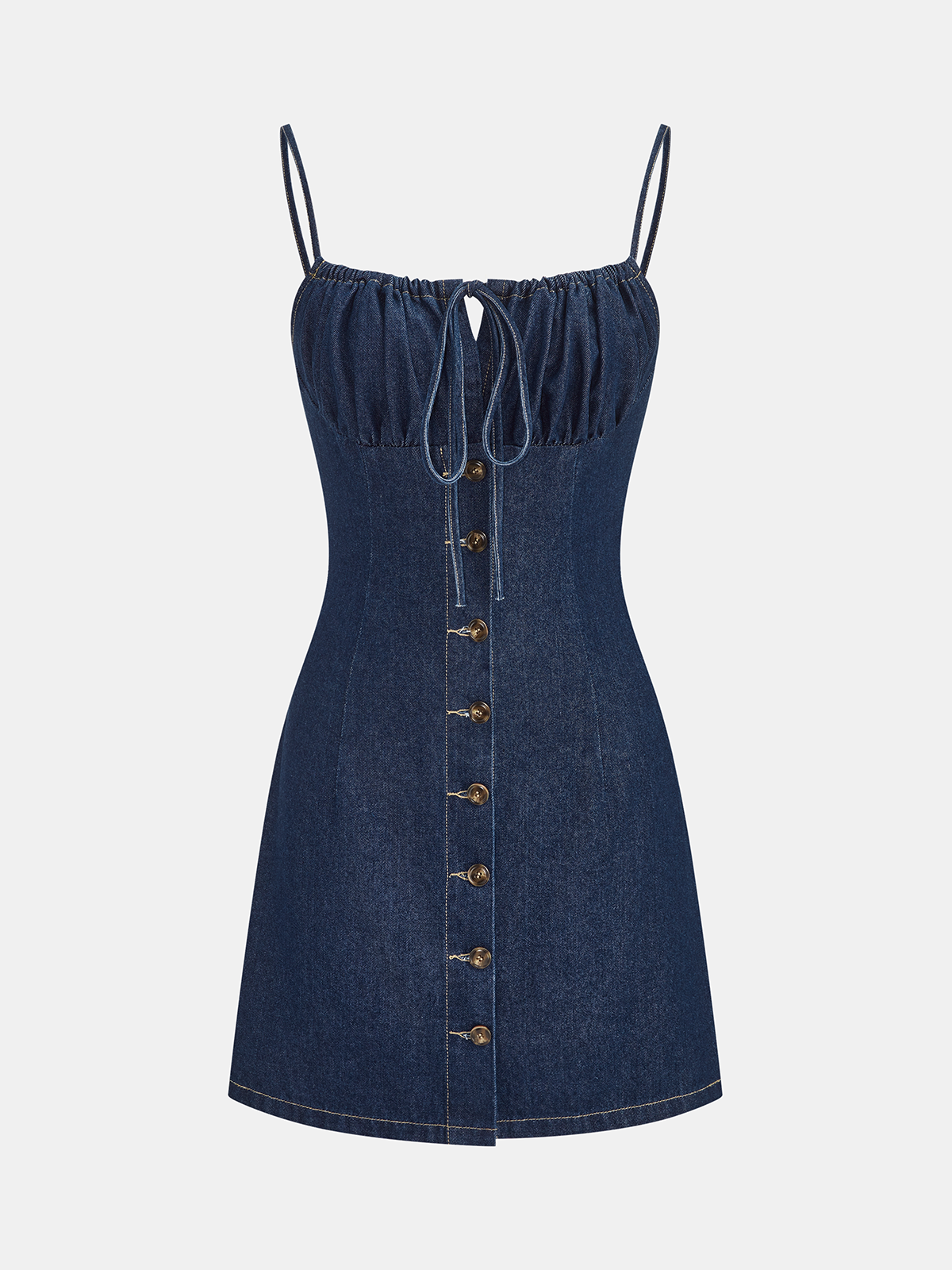 blue,clothing,coll:denim,coll:dresses,coll:short,coll:vacation,coll:weekend_getaway,collarless,date,denim,dresses,in_six_month,minegence,mini,no,not_low_sales,oa260109006,photo_ai,regular,ribbon detail,ruched,sleeveless,slight stretch,slim fit,vacation,women