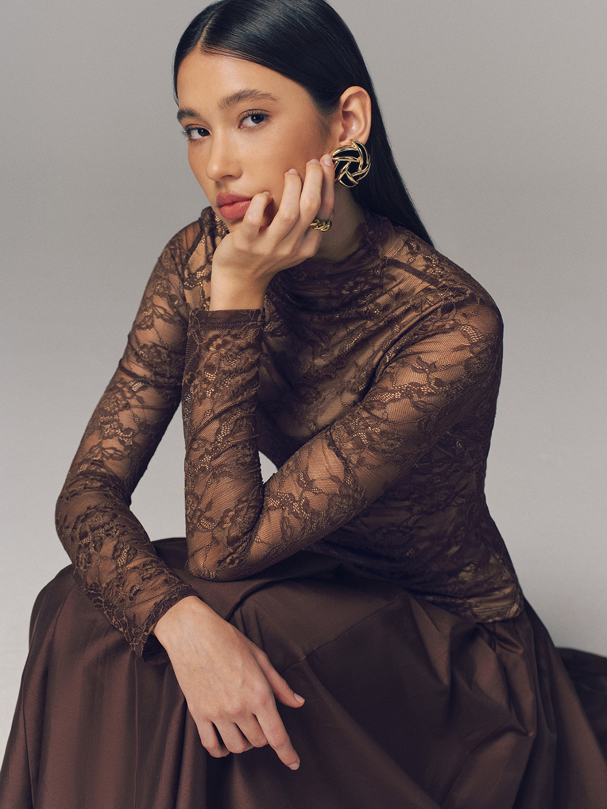 aw pattern,brown,casual,clothing,coll:tops,date,fall,feminine,high stretch,in_six_month,lace,long sleeve,mock neck,no,not_low_sales,oa251023043,photo_model,regular,slim fit,spring,t-shirts,thin,tops,winter,winter hues,women
