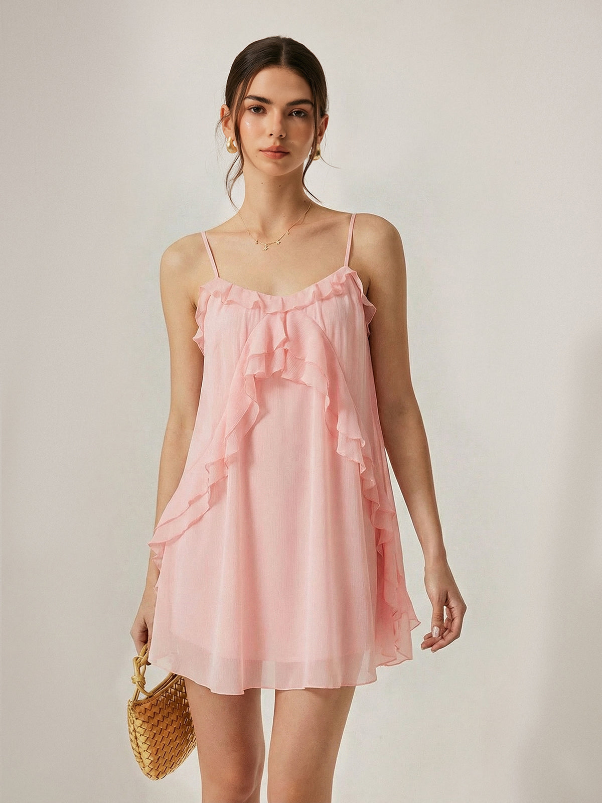 chiffon,clothing,coll:dresses,coll:short,coll:vacation,coll:weekend_getaway,date,dresses,feminine,in_six_month,low cut,mini,no,non-stretch,not_low_sales,oa260119012,photo_ai,pink,regular,ruffle,shift,sleeveless,summer hues,vacation,women