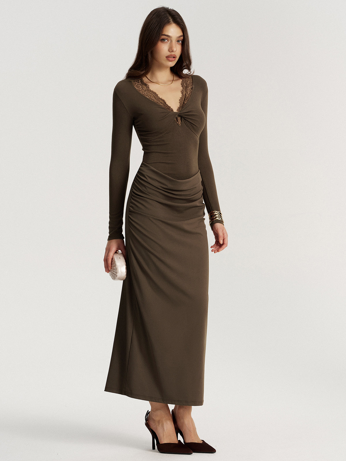 Twisted Lace V-Neck Ruched Maxi Dress