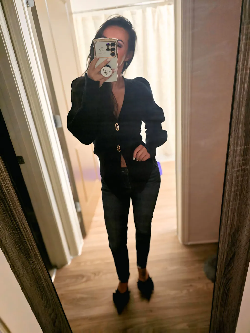 Absolutely loved wearing this cardigan last night. Great quality, the material is so soft and comfortable. I'm 5'1" 113Ibs, 36C and I'm wearing a small. It's so classy! I paired it with jeans and black heels.