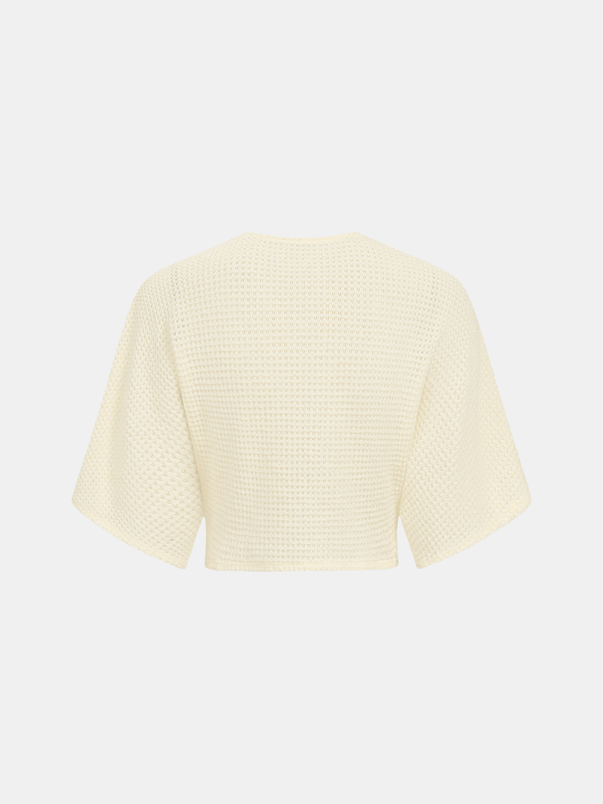 beige,clothing,coll:knitwear,coll:tops,coll:vacation,coll:weekend_getaway,crochet,date,feminine,in_six_month,no,non-stretch,not_low_sales,oa251217016,regular,regular fit,short sleeve,short top,t-shirts,tied&knot,tops,v-neck,vacation,women,woven fabric