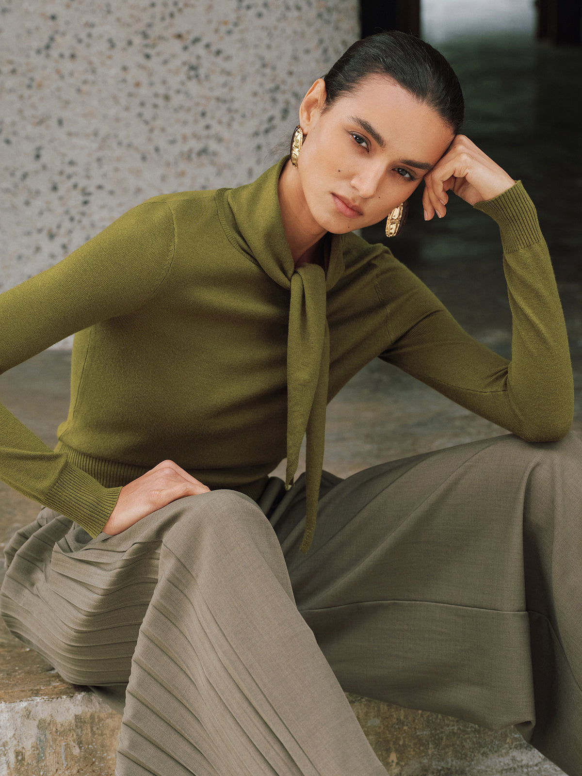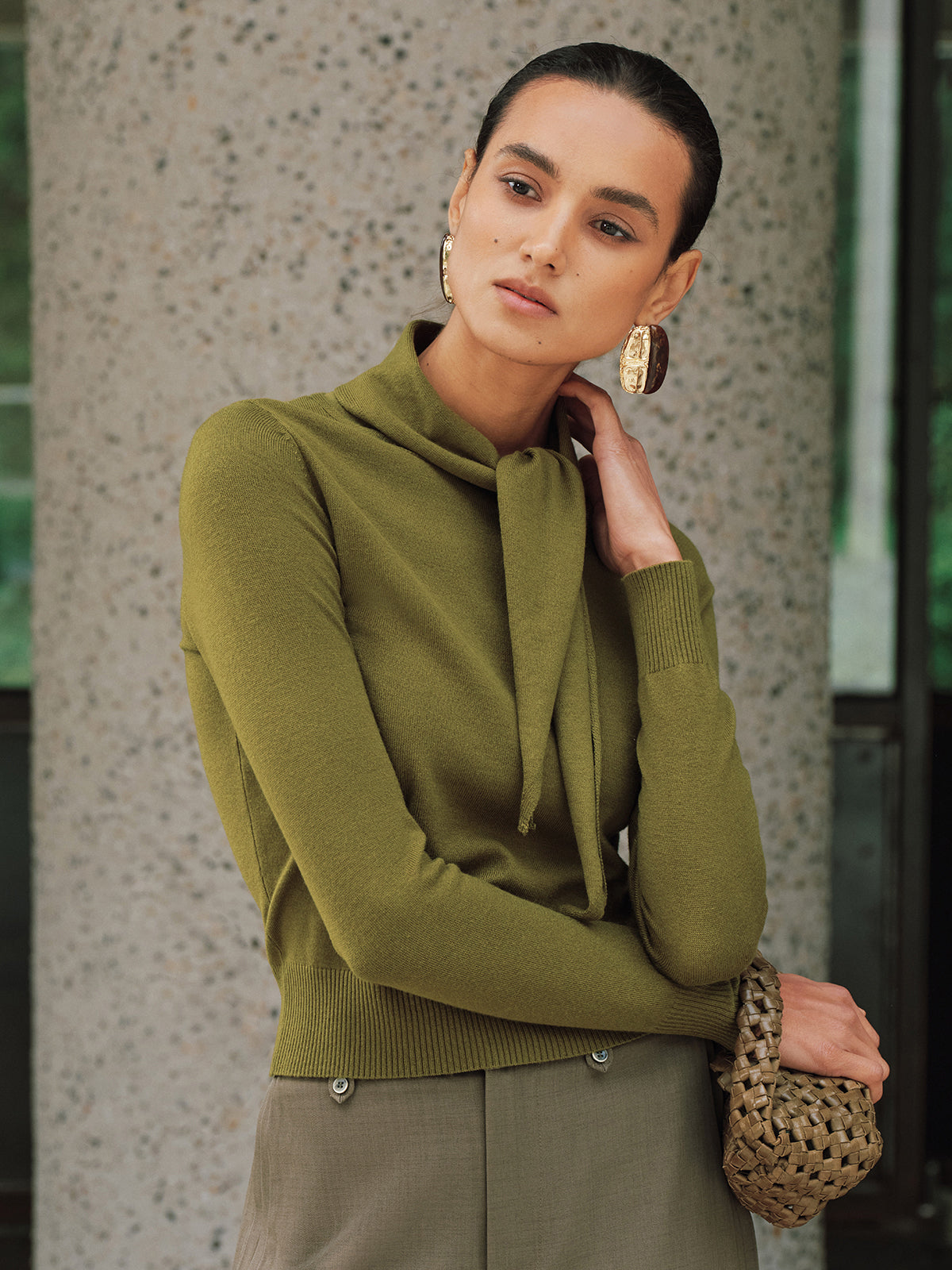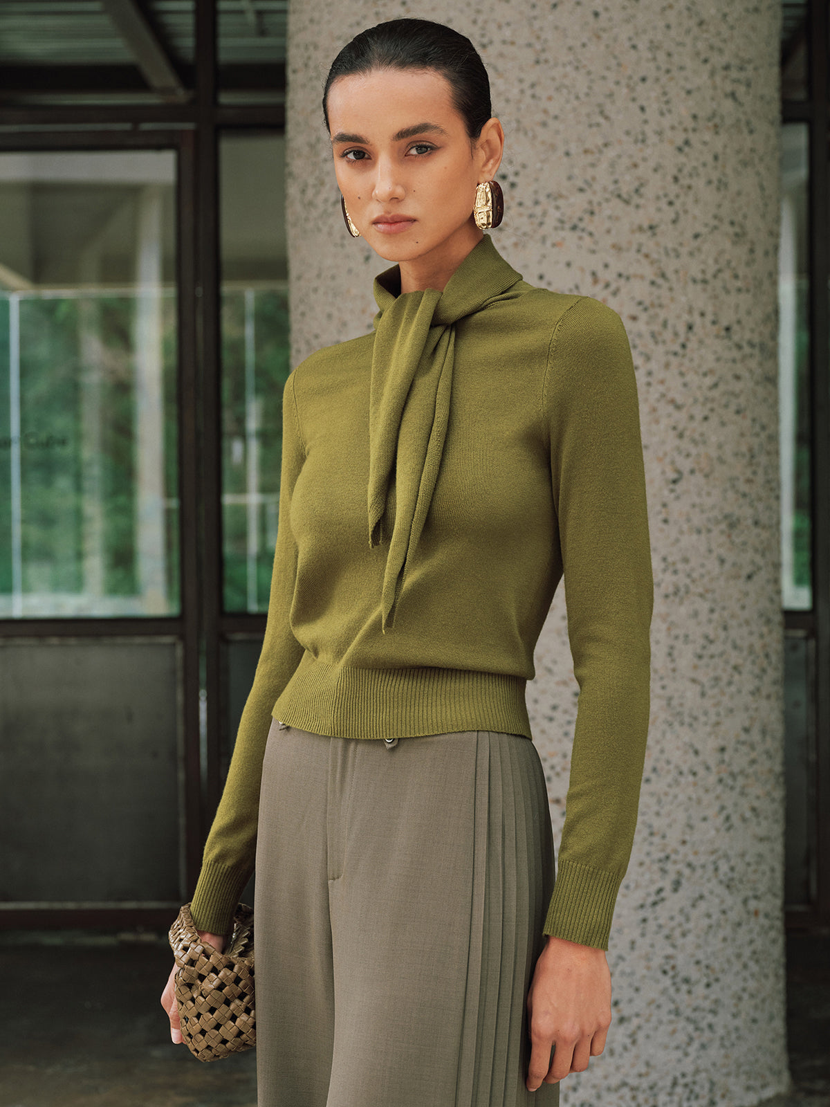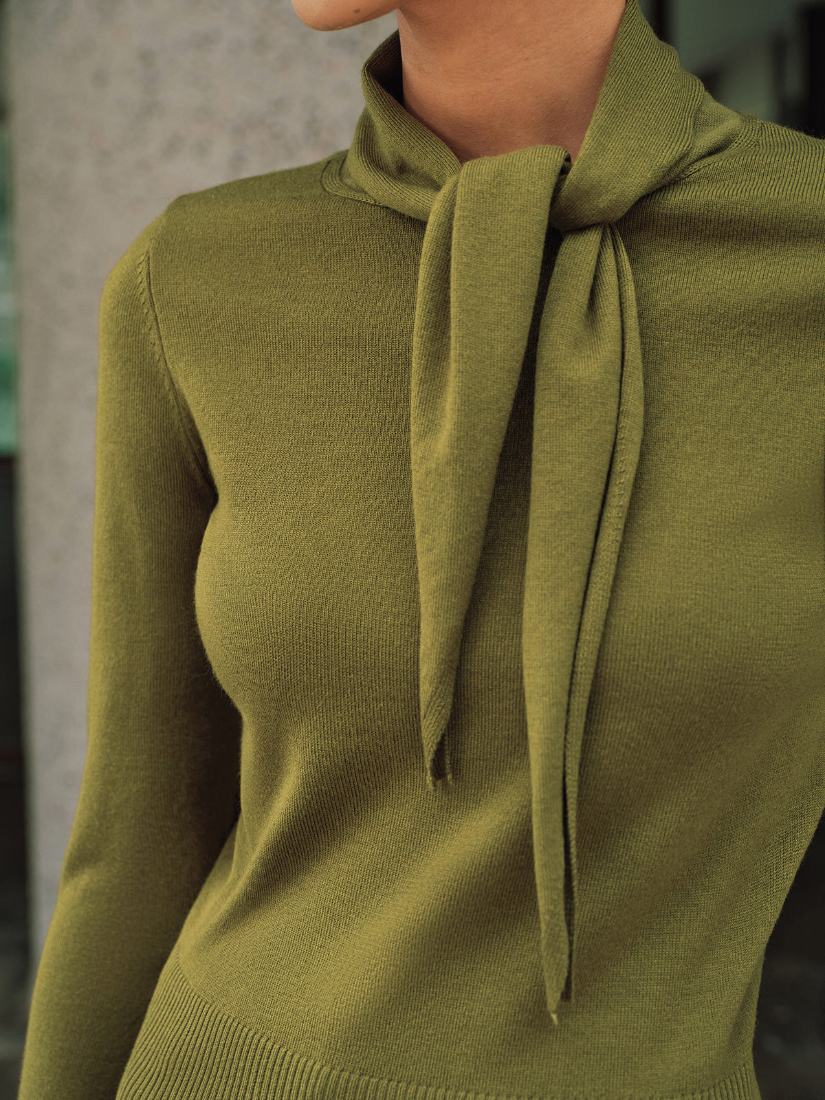 Wool-Blend Tie-Neck Fitted Knit Top
