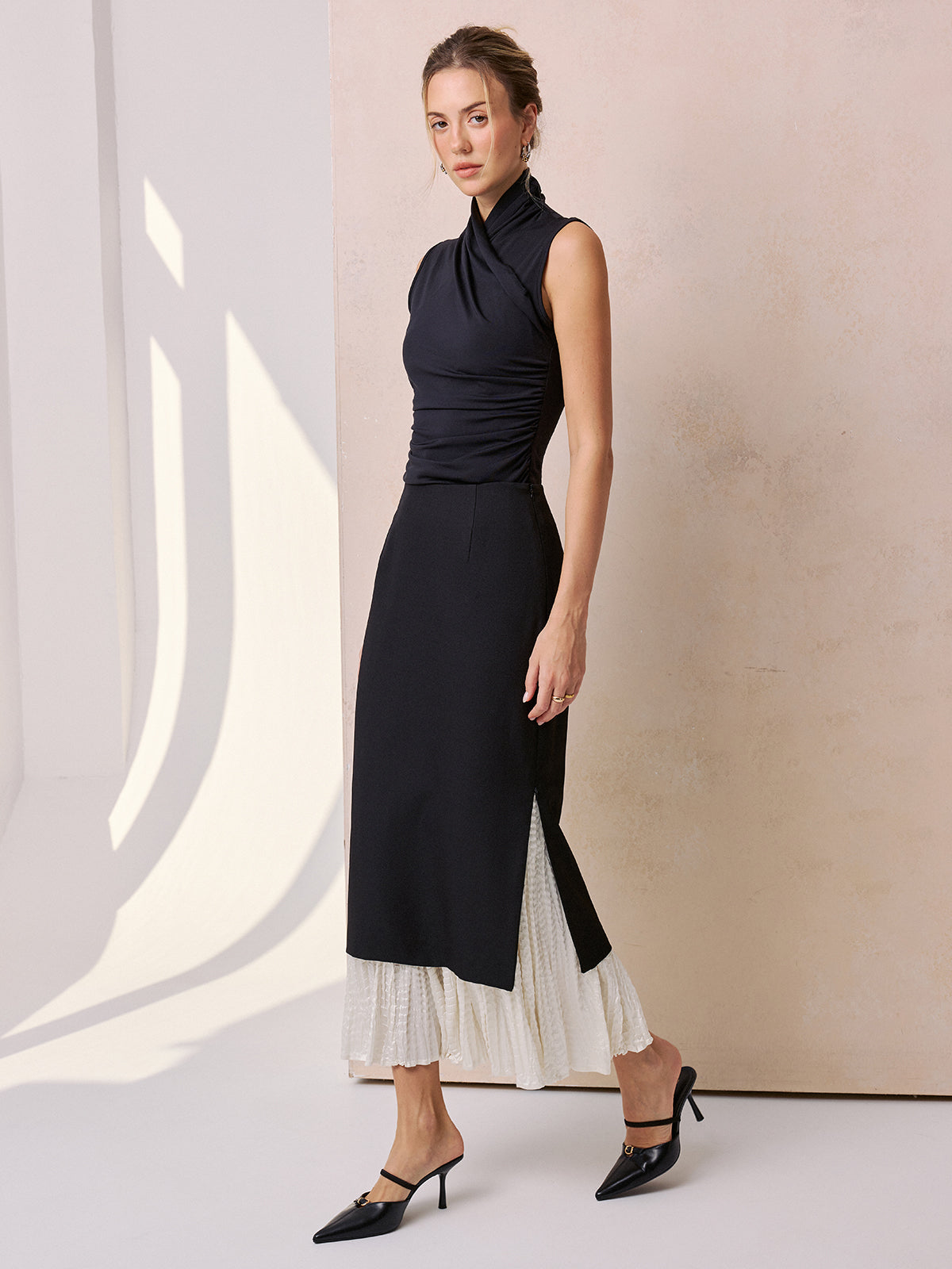 blackandwhite,bottoms,clothing,coll:bottoms,coll:skirts,color block,corpcore,date,high waist,in_six_month,maxi,minegence,modern minimal,no,non-stretch,not_low_sales,oa251014095,patchwork,photo_model,pleated,regular,regular fit,skirts,women,woven fabric