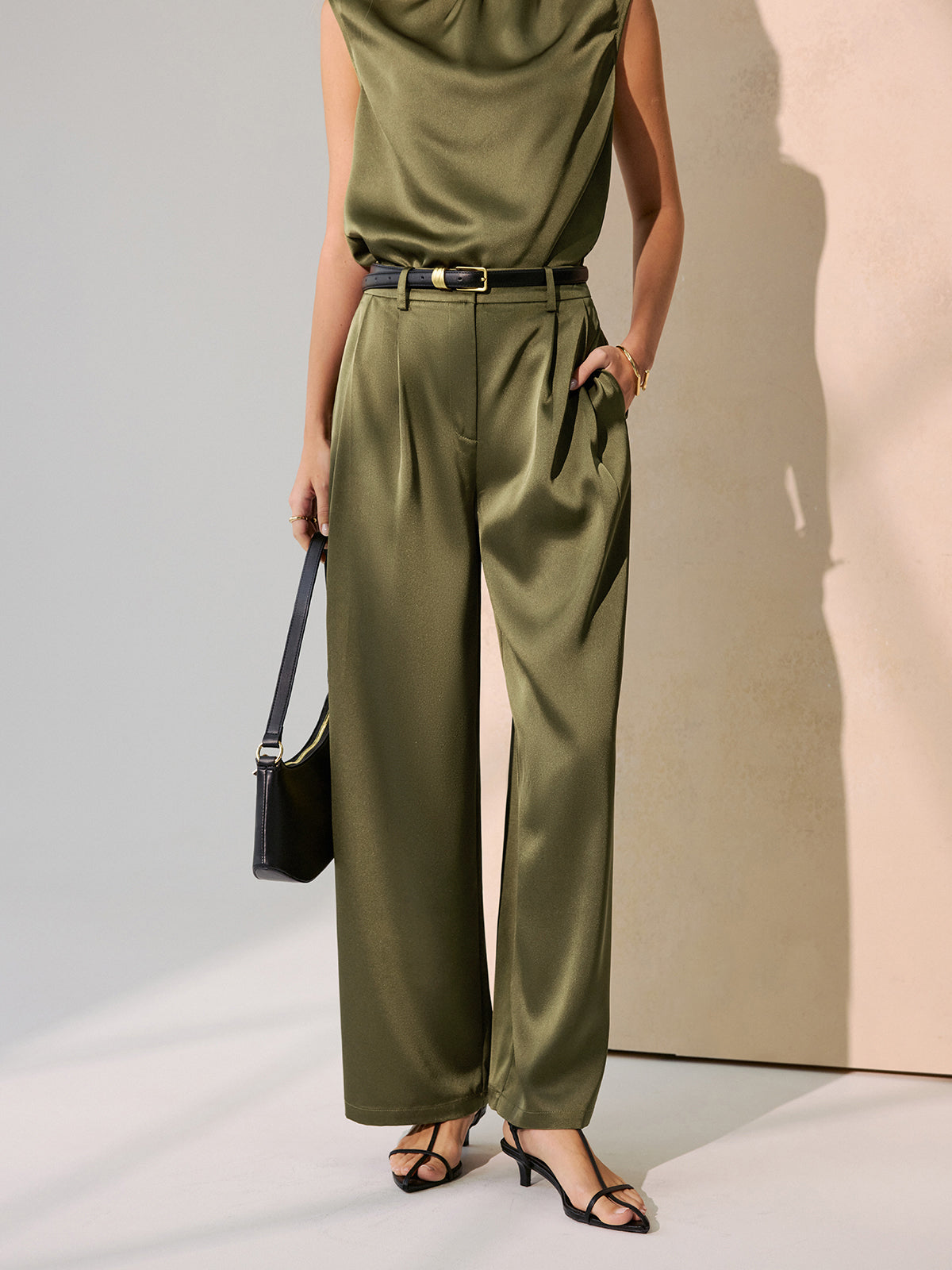 armygreen,casual,clothing,coll:bottoms,coll:matching_sets,corpcore,in_six_month,minegence,modern minimal,non belted,non-stretch,not_low_sales,oa251110003,pant sets,photo_model,regular,regular fit,ruched,satin,sets,winter hues,women