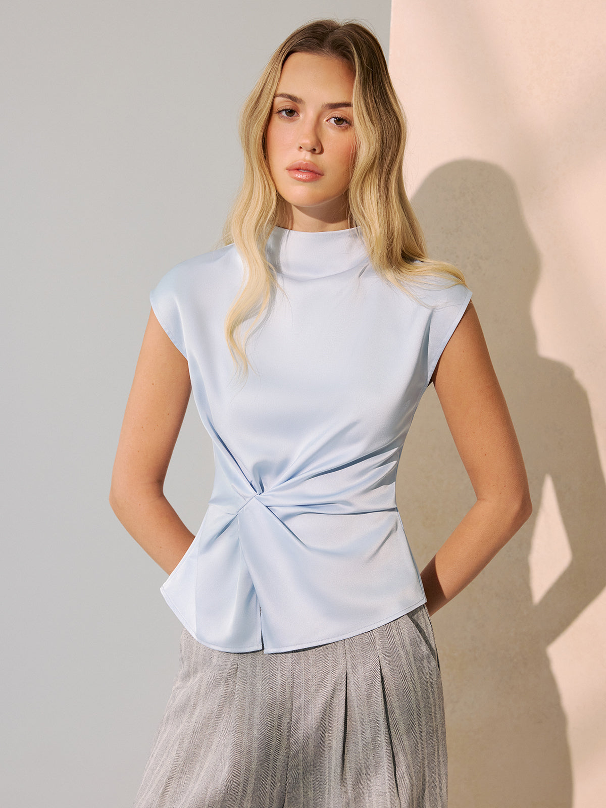 Twist-Front Satin Mock Neck Sleeveless Top