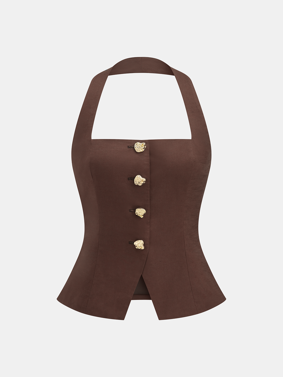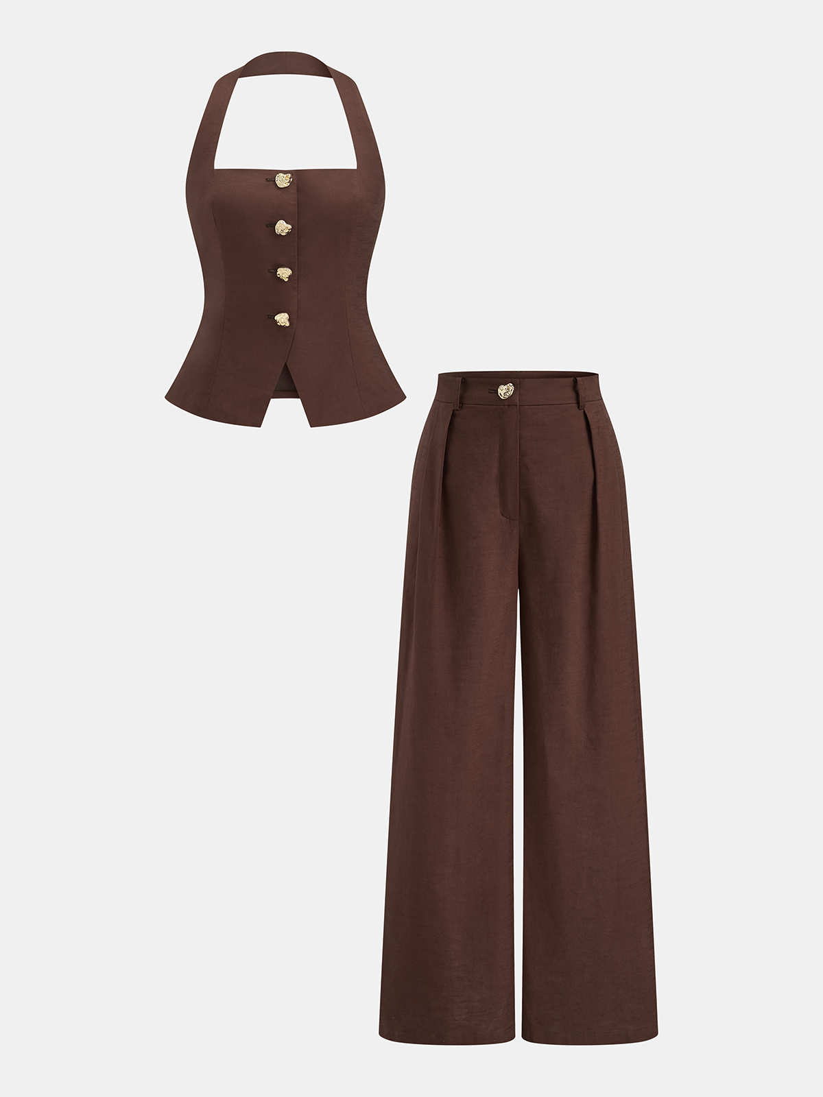 backless,brown,casual,clothing,coll:bottoms,coll:linen_cotton,coll:matching_sets,coll:sheer_bare-back,corpcore,cotton&linen,halter,in_six_month,metal detail,minegence,non-stretch,not_low_sales,oa260314042,pant sets,regular,regular fit,sets,women