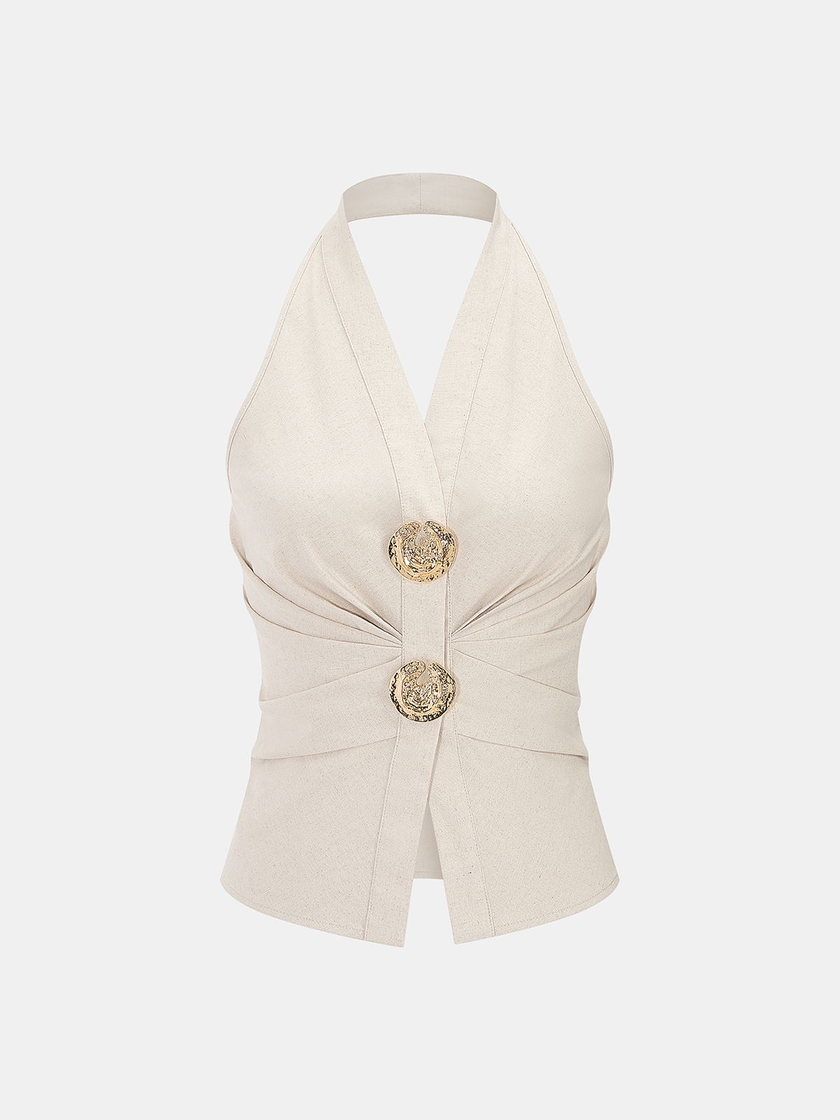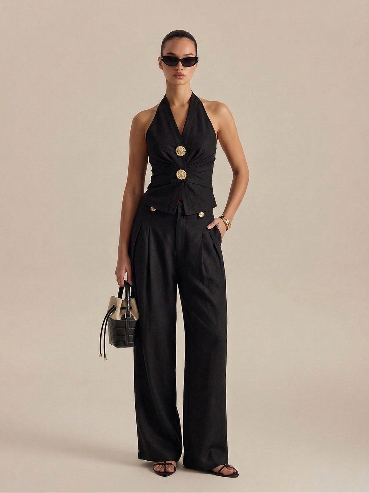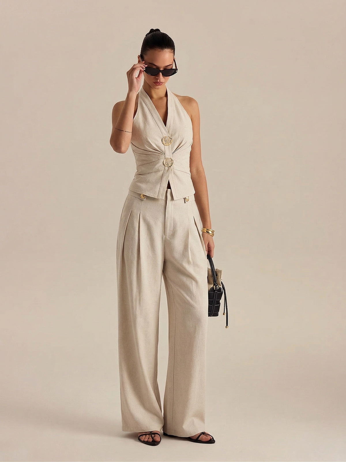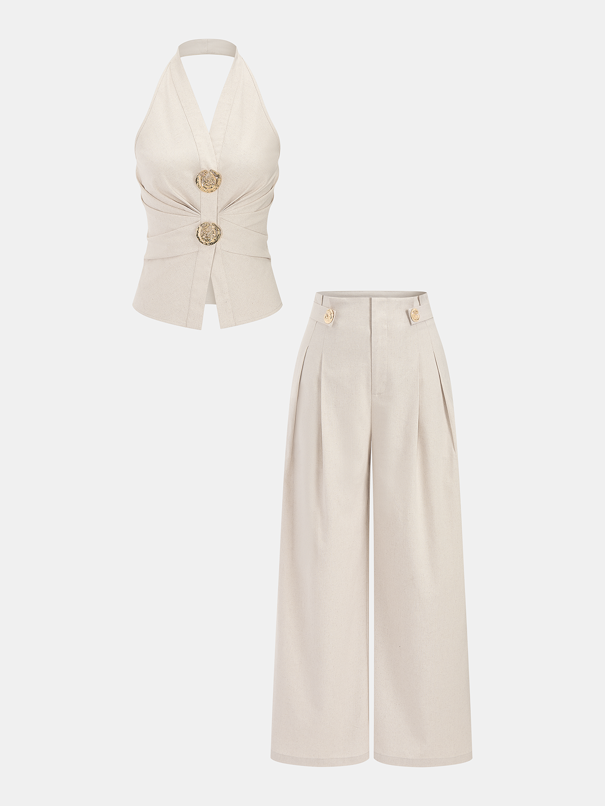 beige,black,casual,clothing,coll:bottoms,coll:linen_cotton,coll:matching_sets,coll:vacation,coll:weekend_getaway,cotton&linen,feminine,halter,in_six_month,metal detail,non-stretch,not_low_sales,oa260304023,pant sets,photo_ai,pleated,regular,regular fit,sets,vacation,women