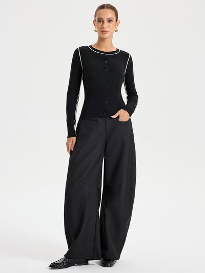 Fitted Long-Sleeve Rib-Knit Top with Metal Button