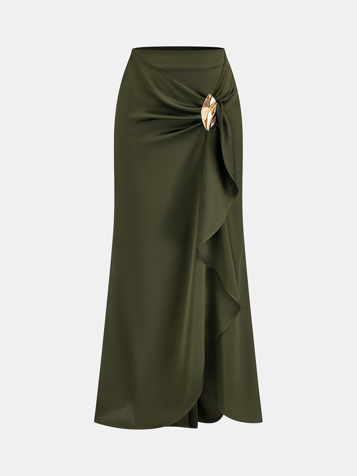 Asymmetric Ruffle Metal Detail Satin Maxi Skirt