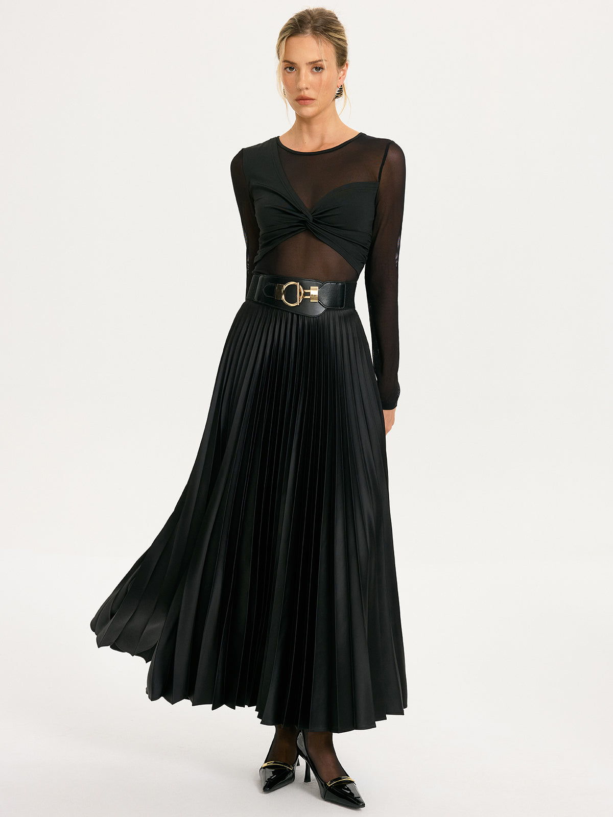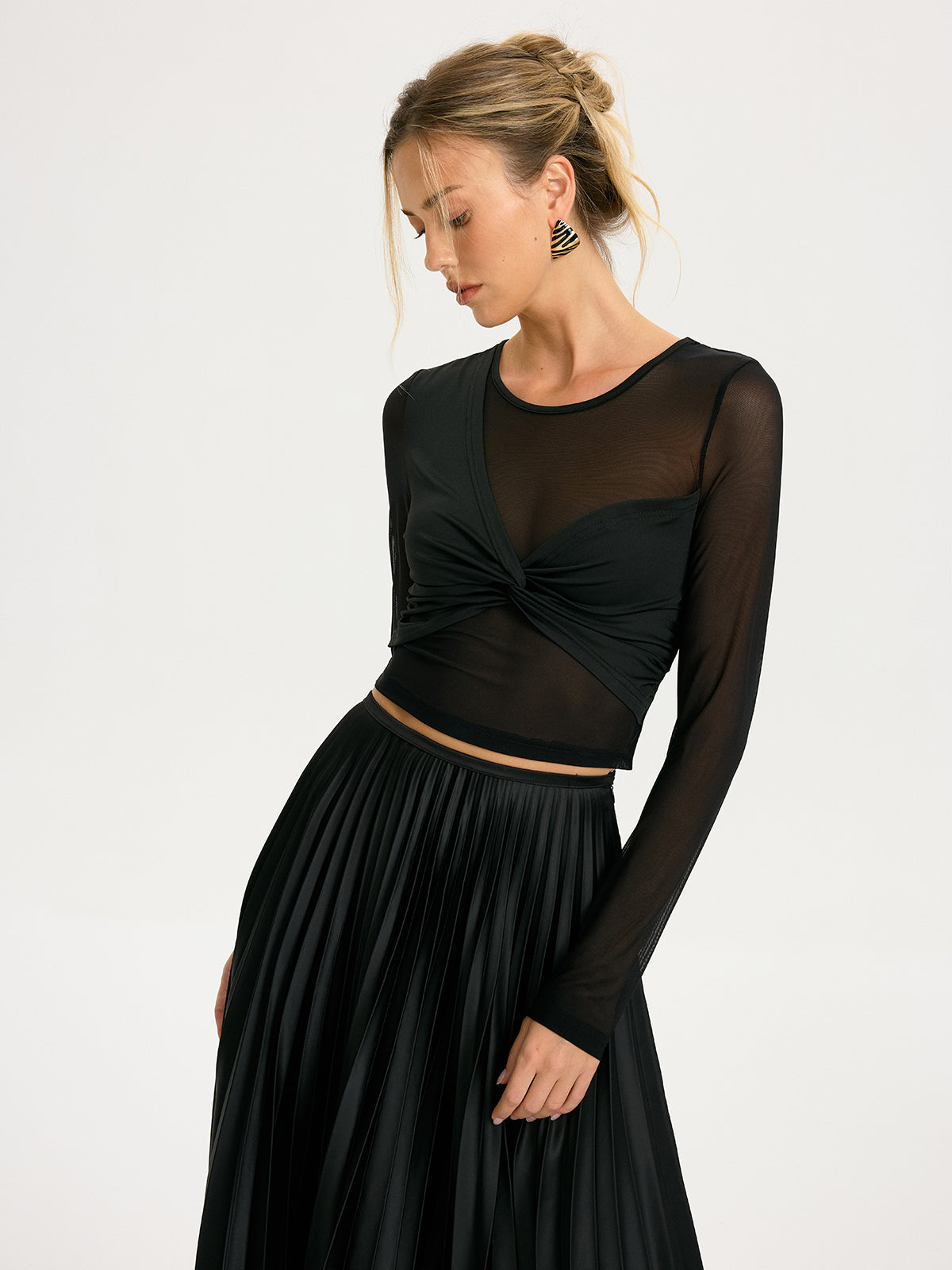 Twist-Front Sheer Mesh Long-Sleeve Top