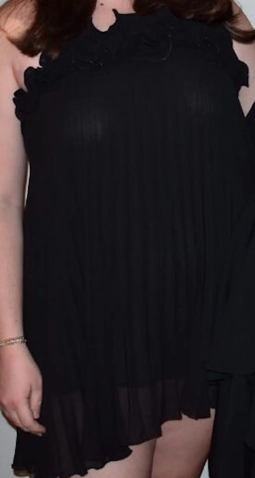 I got this dress in black! It is see through at the bottom and when you hold it up to the light. Not as much when on- but I had a cream/nude colored strapless bra on and you could see the nude in pictures… The top is SO cute but not the best fit for a larger bust (I am 40C/40D). It definitely flattens and makes a lump. Pleating comes undone quickly and the back of my dress had a small spot that lumped together. The lining also is really short!! Overall not the most flattering in my opinion since it has no shape to it- but it worked for my semi formal and I got lots of compliments!