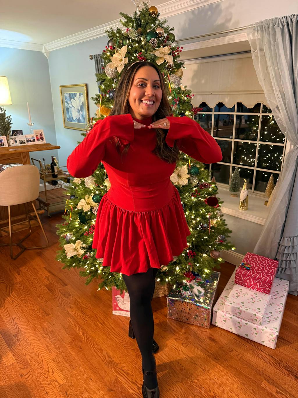 Love, Love, Love this dress. I have it in both, red and black. I wore the red dress last night and receive so many compliments.