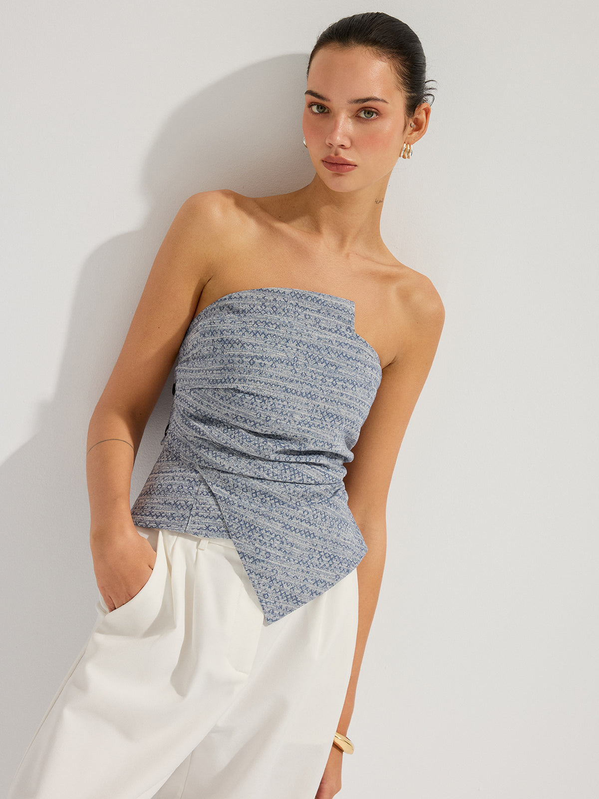 Geometric Print Strapless Ruched Top
