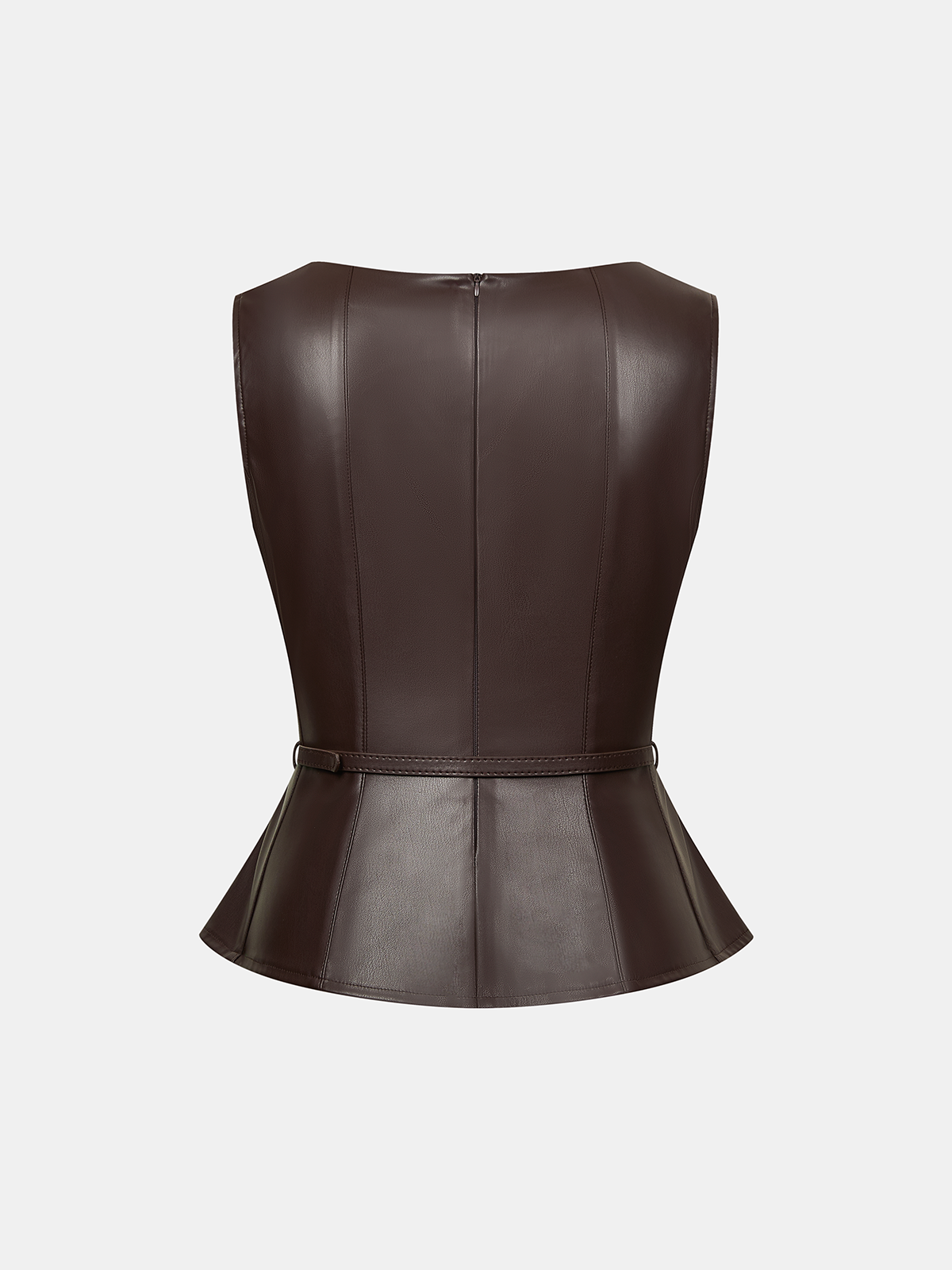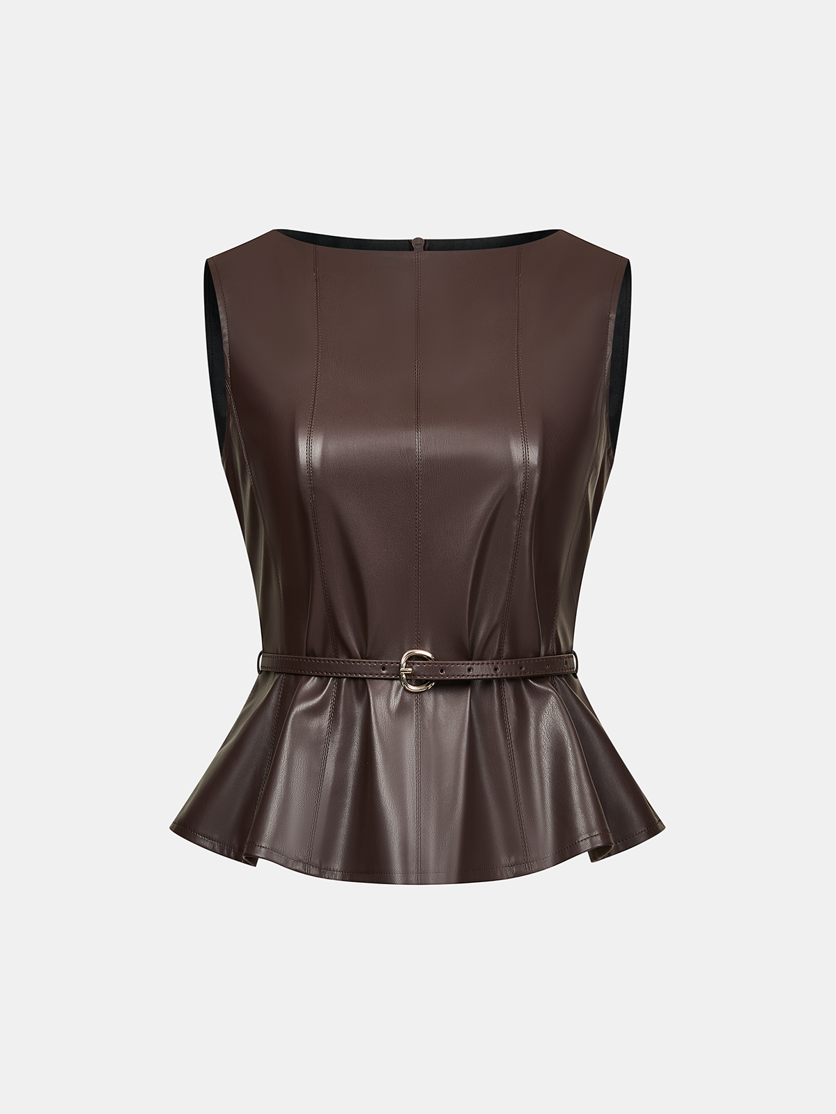 casual,clothing,coll:old_money,coll:tank_tops_camis,coll:tops,coll:vintage_fabrics,crew neck,dark brown,date,fall,faux leather,in_six_month,invisible zipper,minegence,no,non-stretch,not_low_sales,oa251112050,regular,ruffle,short top,sleeveless,slim fit,spring,tank tops & camis,tops,winter,women