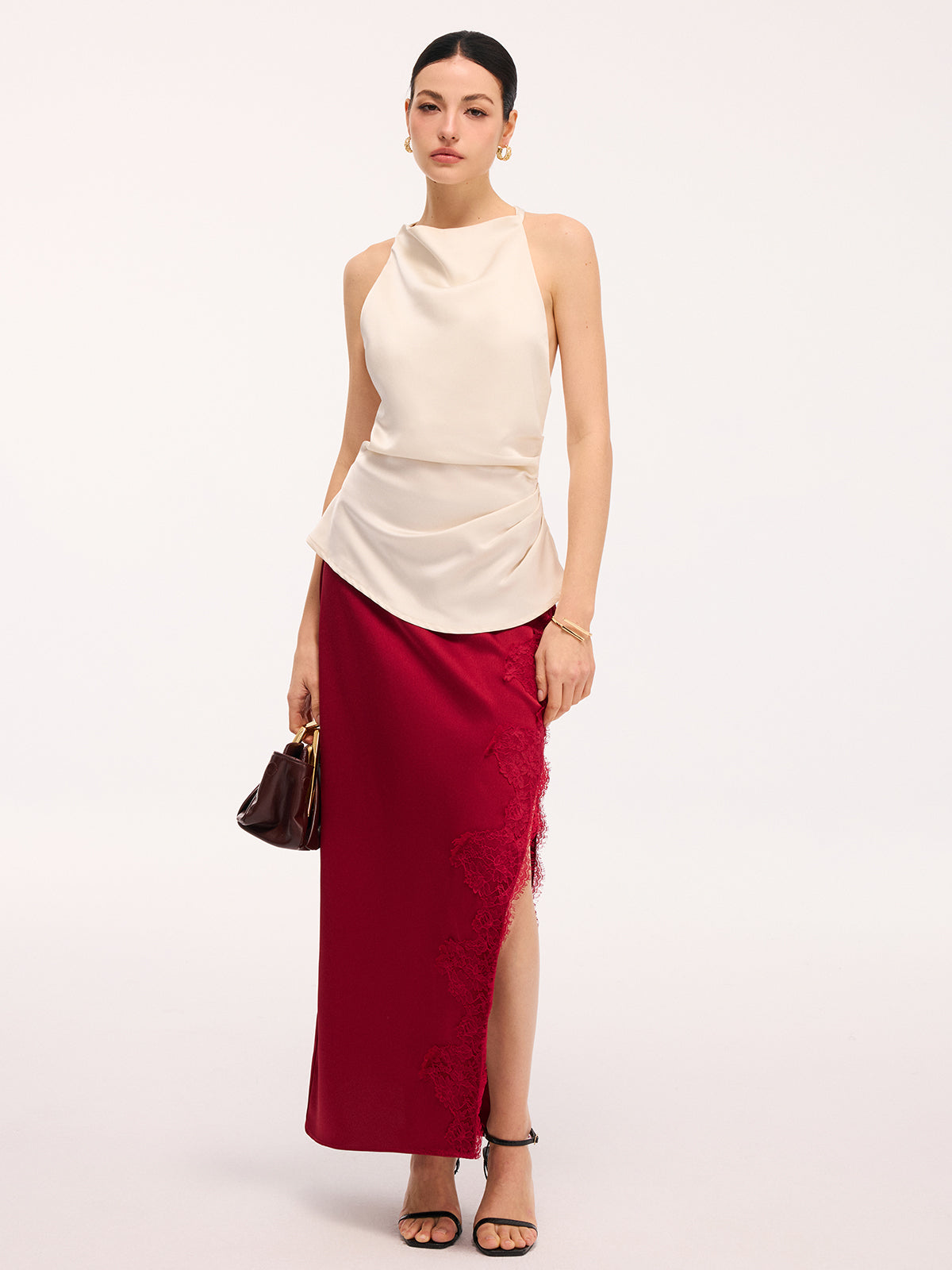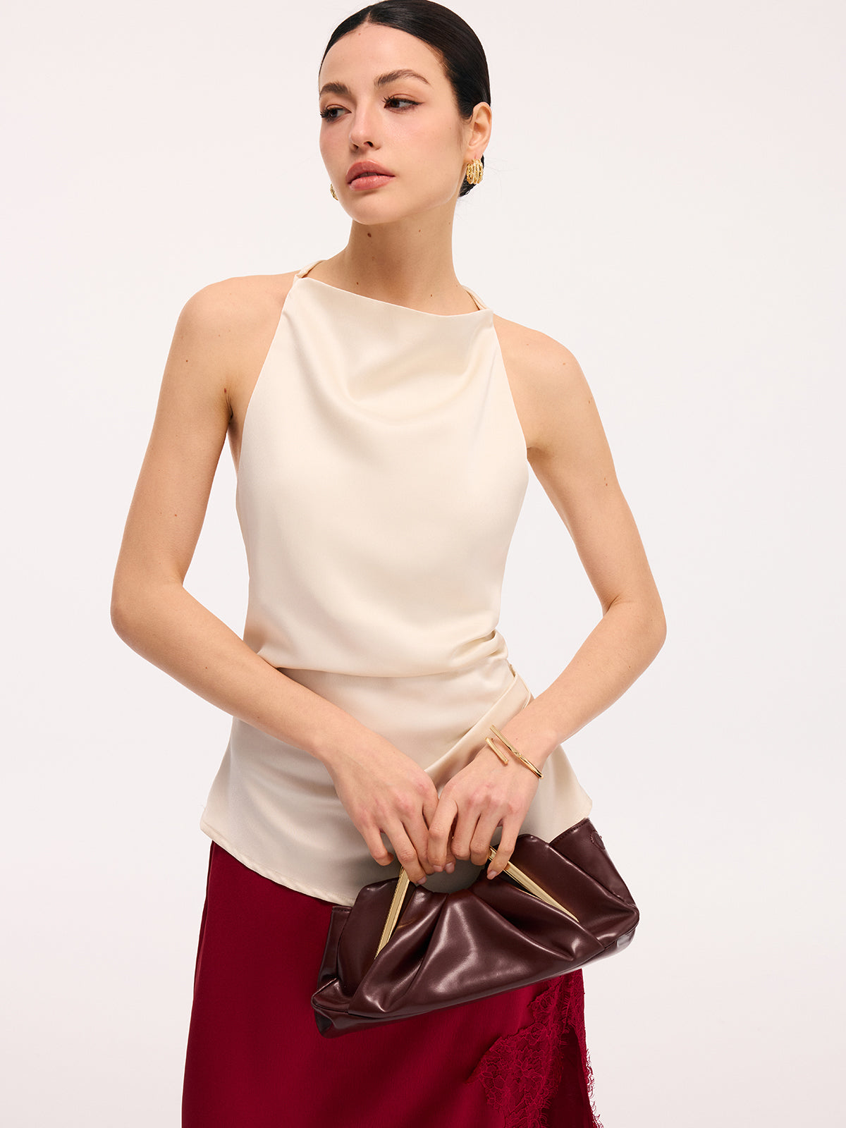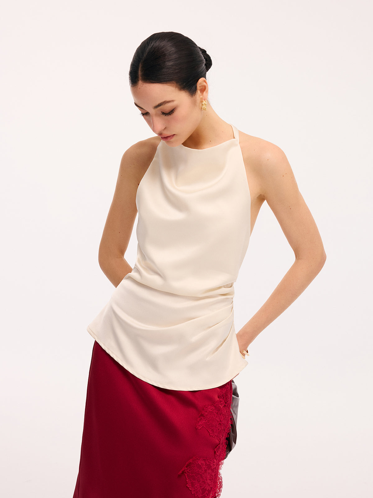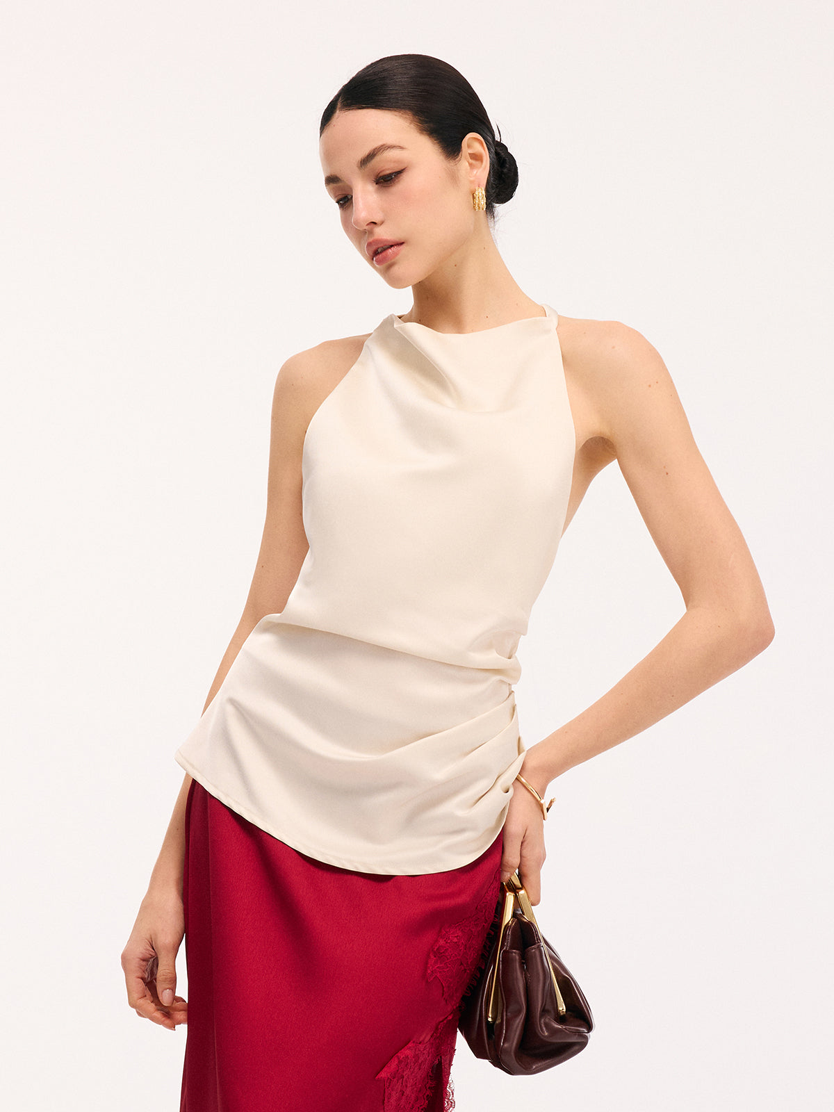 apricot,clothing,coll:tank_tops_camis,coll:tops,corpcore,cowl neck,date,feminine,in_six_month,mwt,no,non-stretch,not_low_sales,oa251128061,photo_model,regular,regular fit,ruched,satin,season of love,sleeveless,tank tops & camis,tops,women