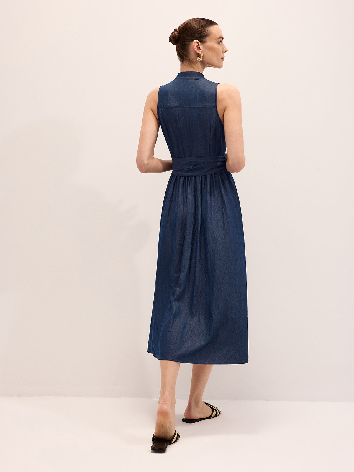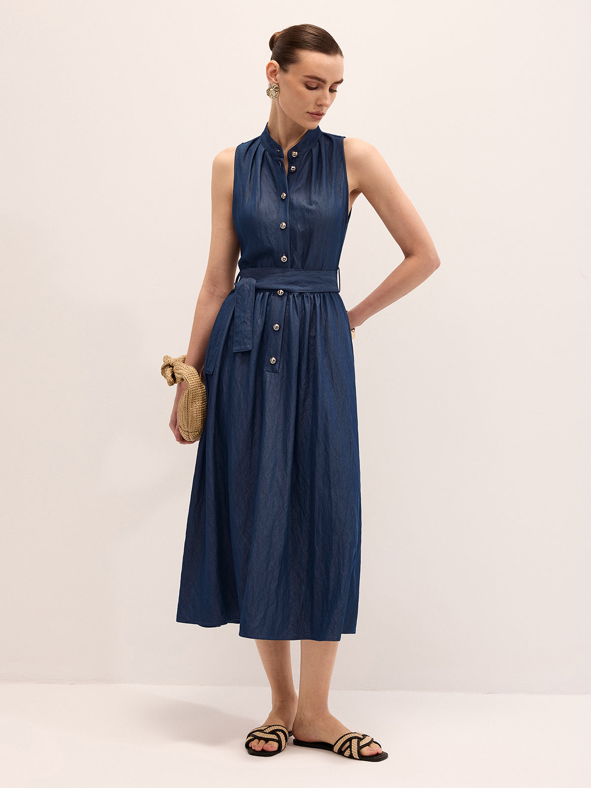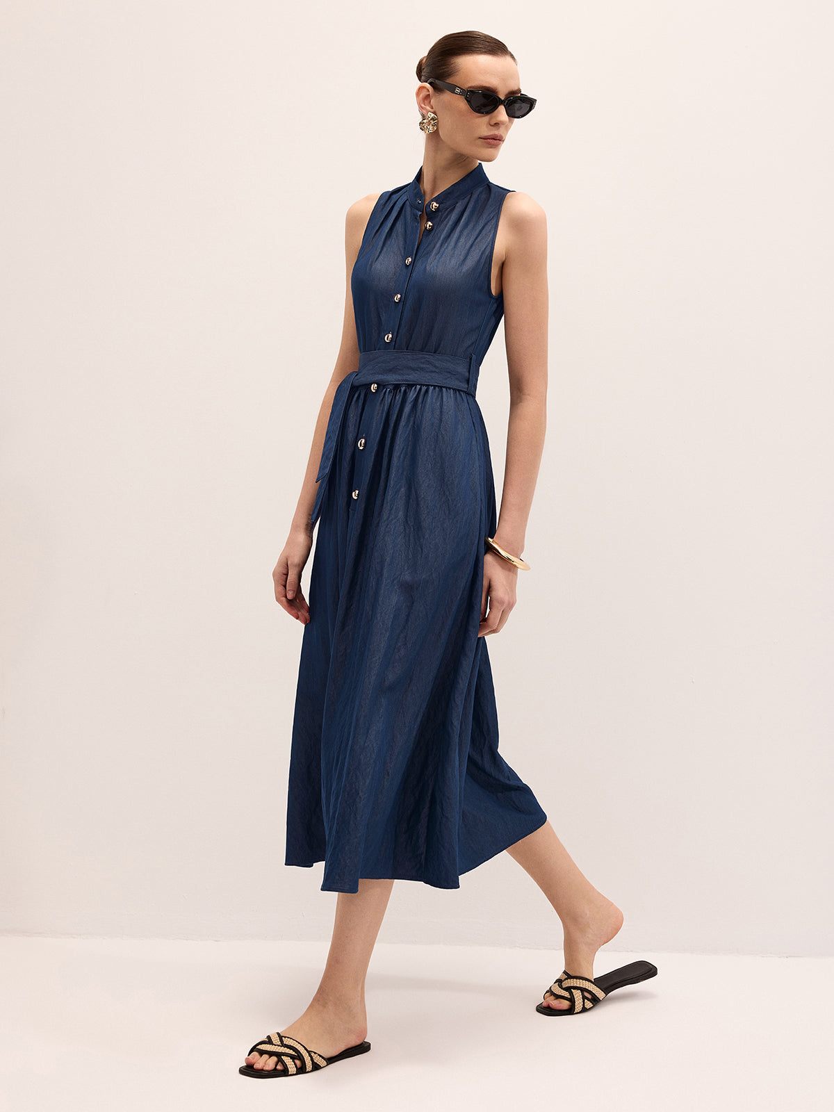 belted,casual,clothing,coll:dresses,coll:linen_cotton,collar,corpcore,cotton blends,dresses,in_six_month,maxi,metal detail,minegence,navy,no,non-stretch,not_low_sales,oa260116041,photo_model,regular fit,sleeveless,the linen ease,thin,umbrella hem,women