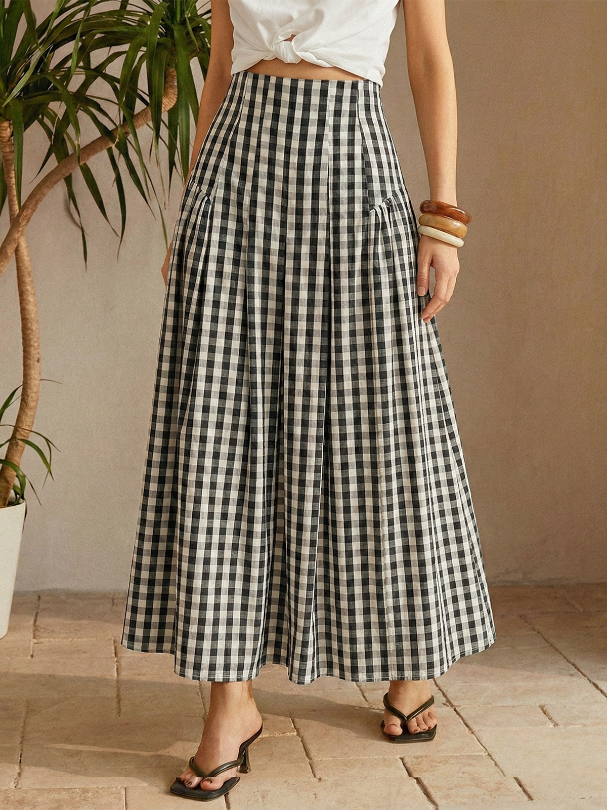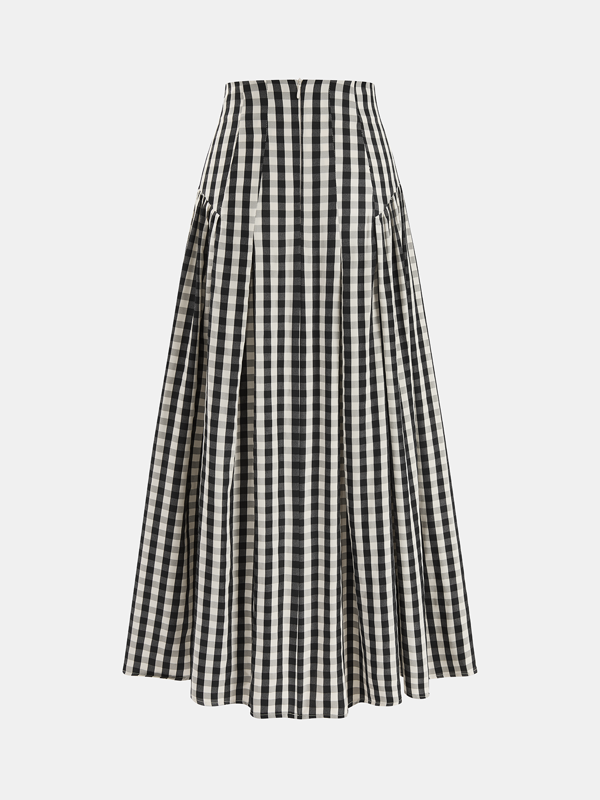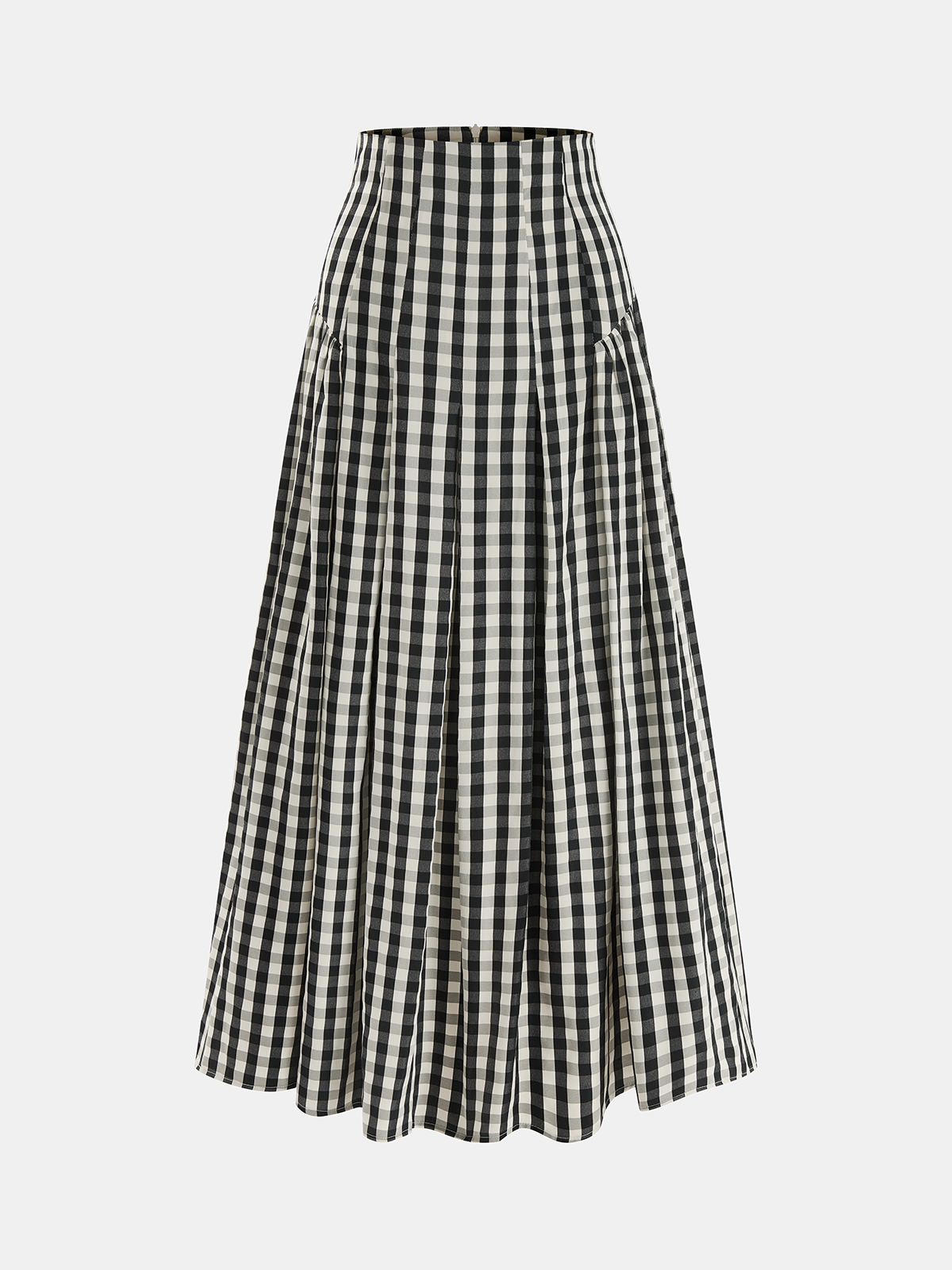 blackandwhite,bottoms,casual,clothing,coll:bottoms,coll:plaids_polka,coll:skirts,high waist,in_six_month,invisible zipper,midi,minegence,no,not_low_sales,oa251229031,photo_ai,plaid,pleated,regular,regular fit,skirts,slight stretch,the linen ease,umbrella hem,women,woven fabric