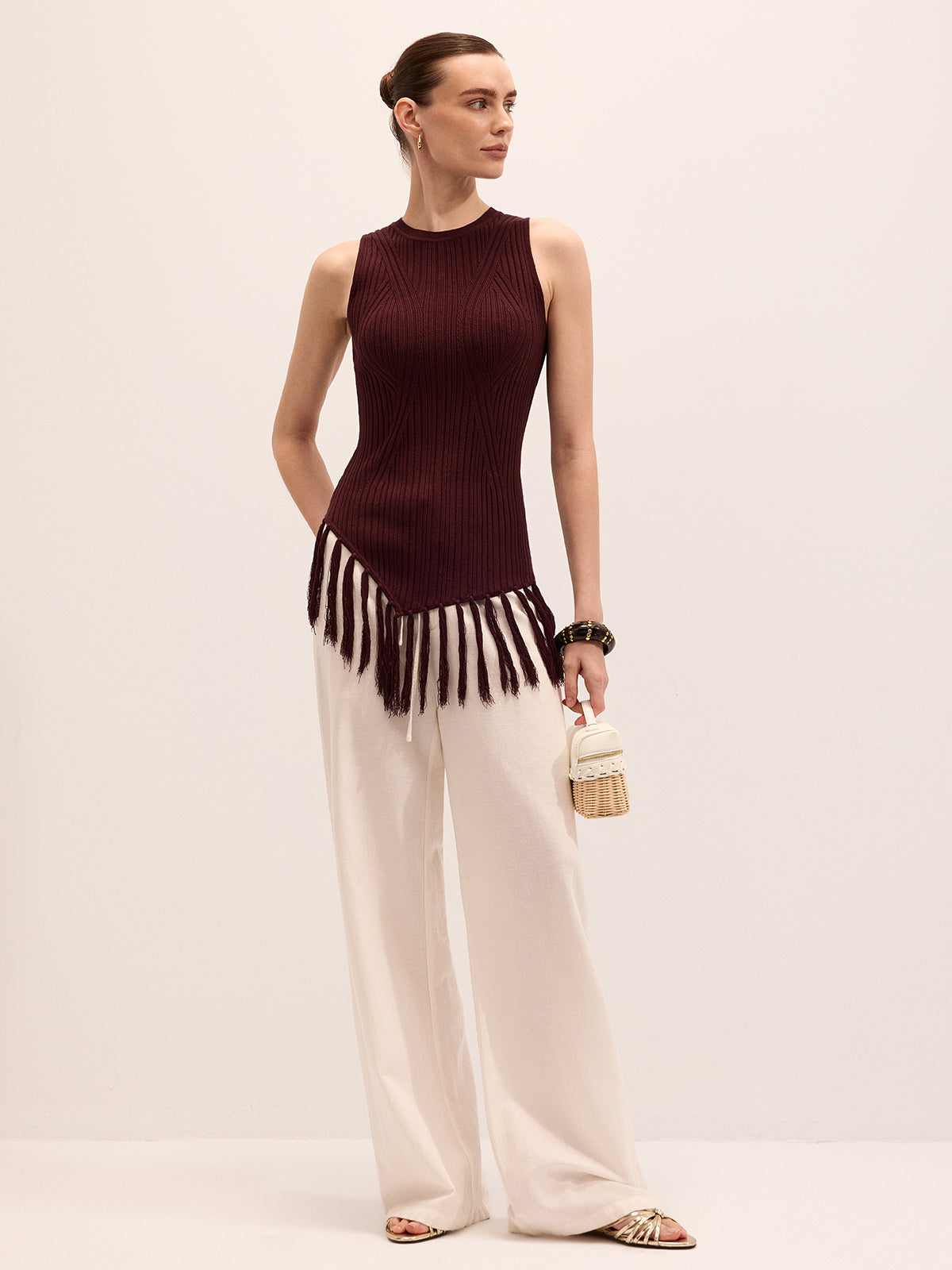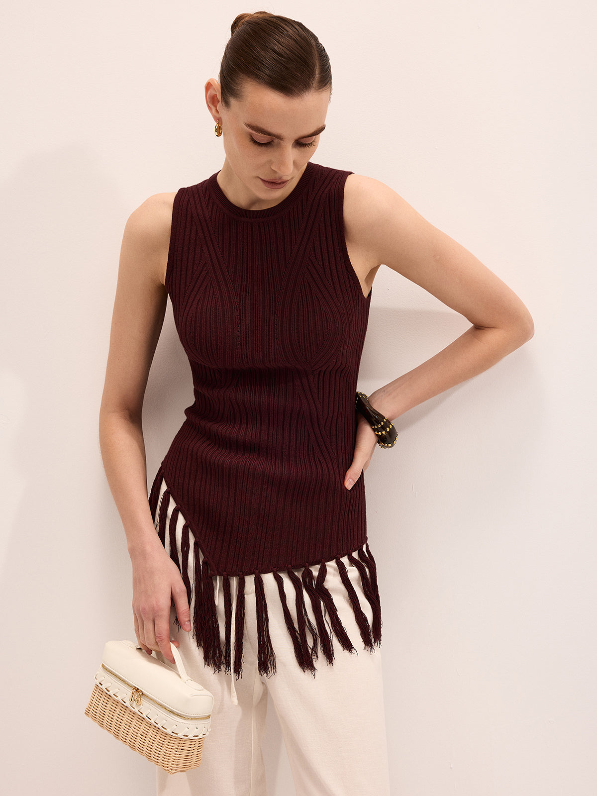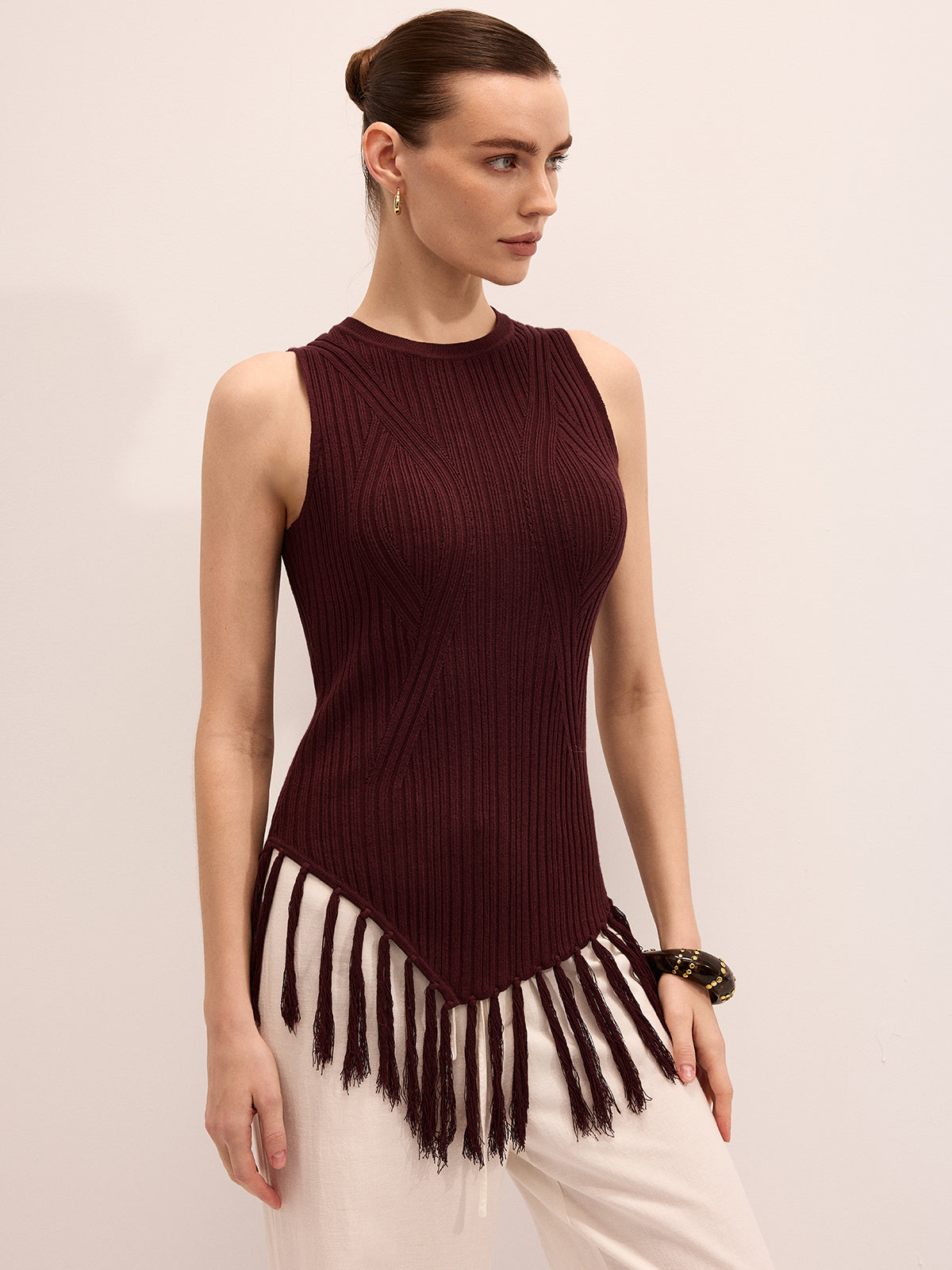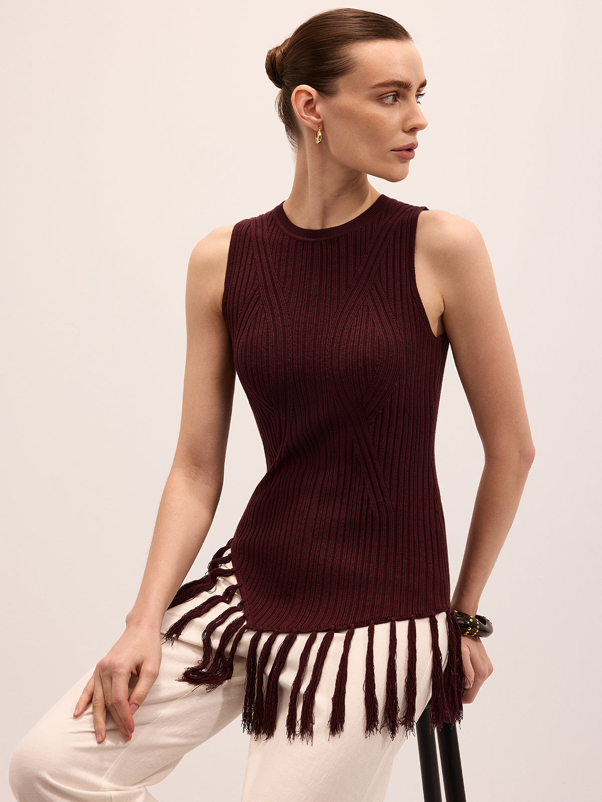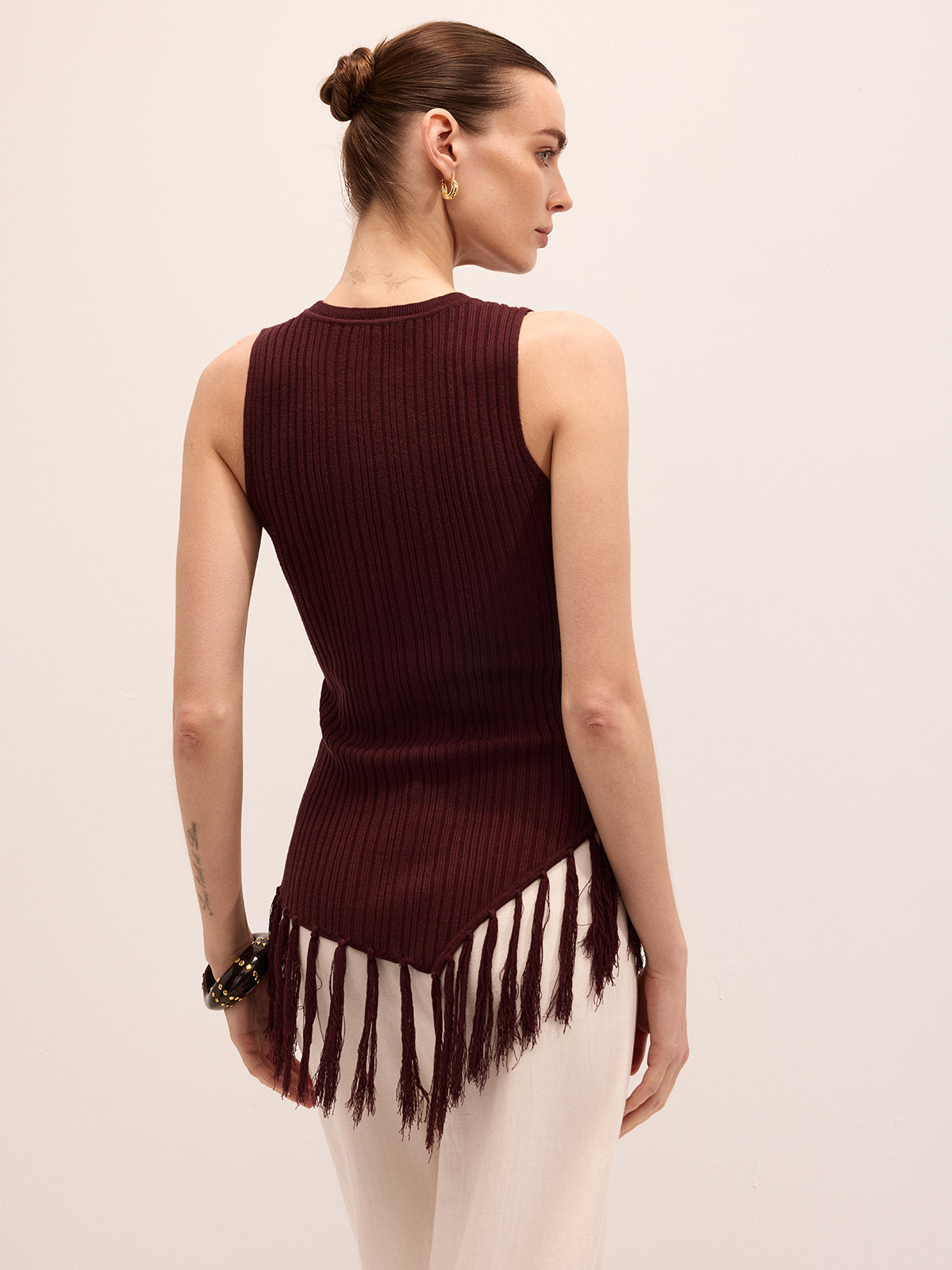 asymmetric,bohochic,casual,clothing,coll:knitwear,coll:sweaters_cardigans,coll:tops,coll:trending,coll:vacation,coll:vests,coll:weekend_getaway,dark brown,fringe,in_six_month,knit,knitwear,minegence,not_low_sales,oa251129014,photo_model,regular,regular fit,slight stretch,sweater vests,the linen ease,vacation,women