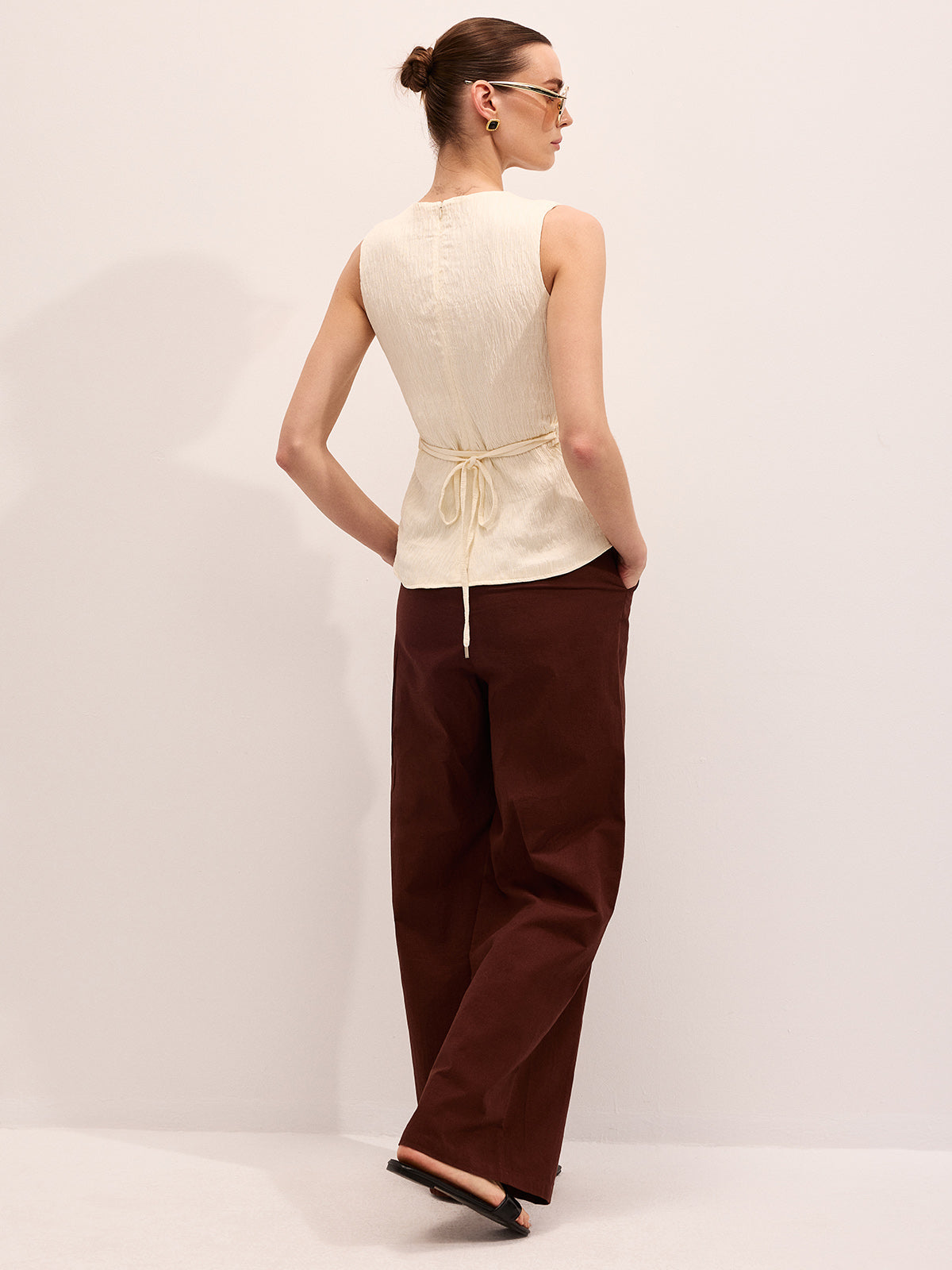 beige,blouses,casual,clothing,coll:blouses_shirts,coll:tops,in_six_month,minegence,no,not_low_sales,oa260305024,photo_model,regular,regular fit,sleeveless,slight stretch,the linen ease,tied&knot,tops,v-neck,women,woven fabric