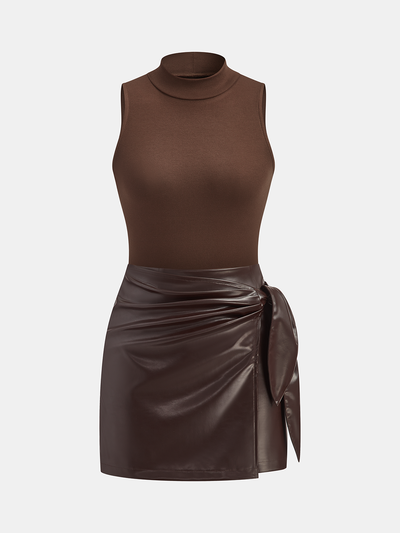 Off-Shoulder Faux Leather Waistband Slit Maxi Dress
