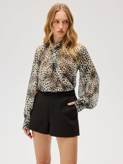 Semi-Sheer Chiffon Leopard Print Tie Neck Shirt