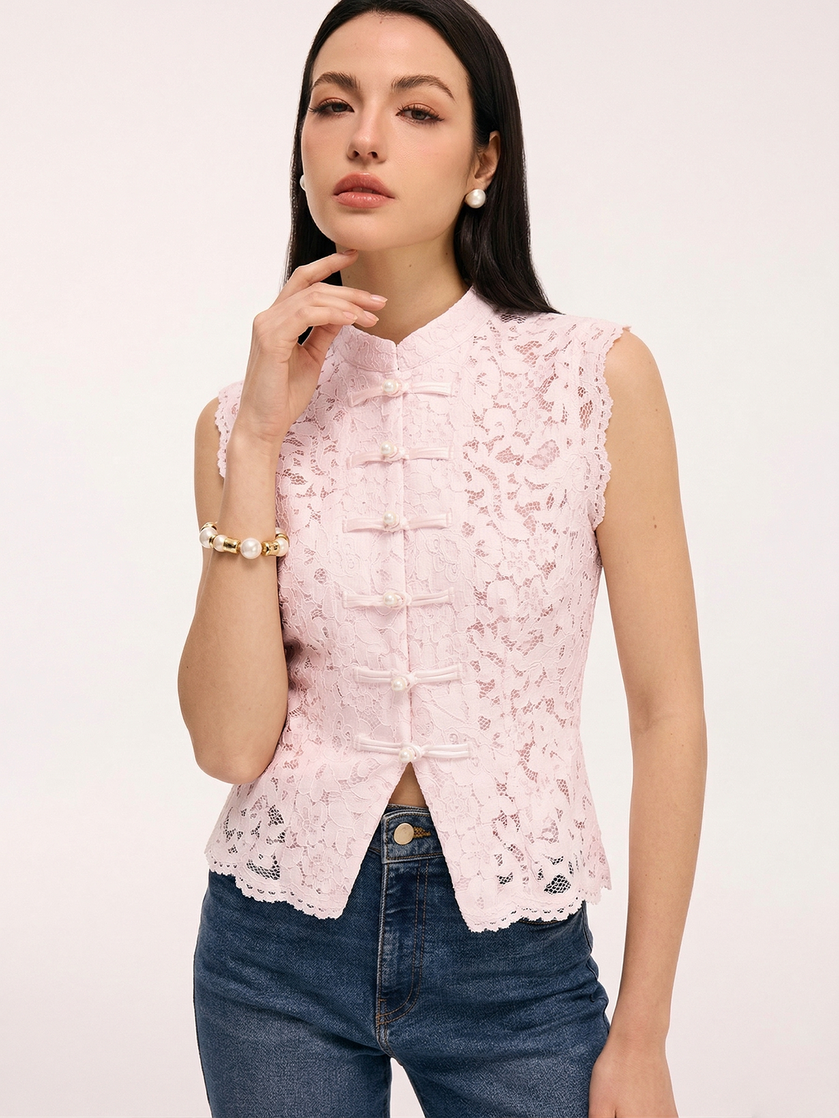 Lace Mandarin Collar Pearl Button Sleeveless Top