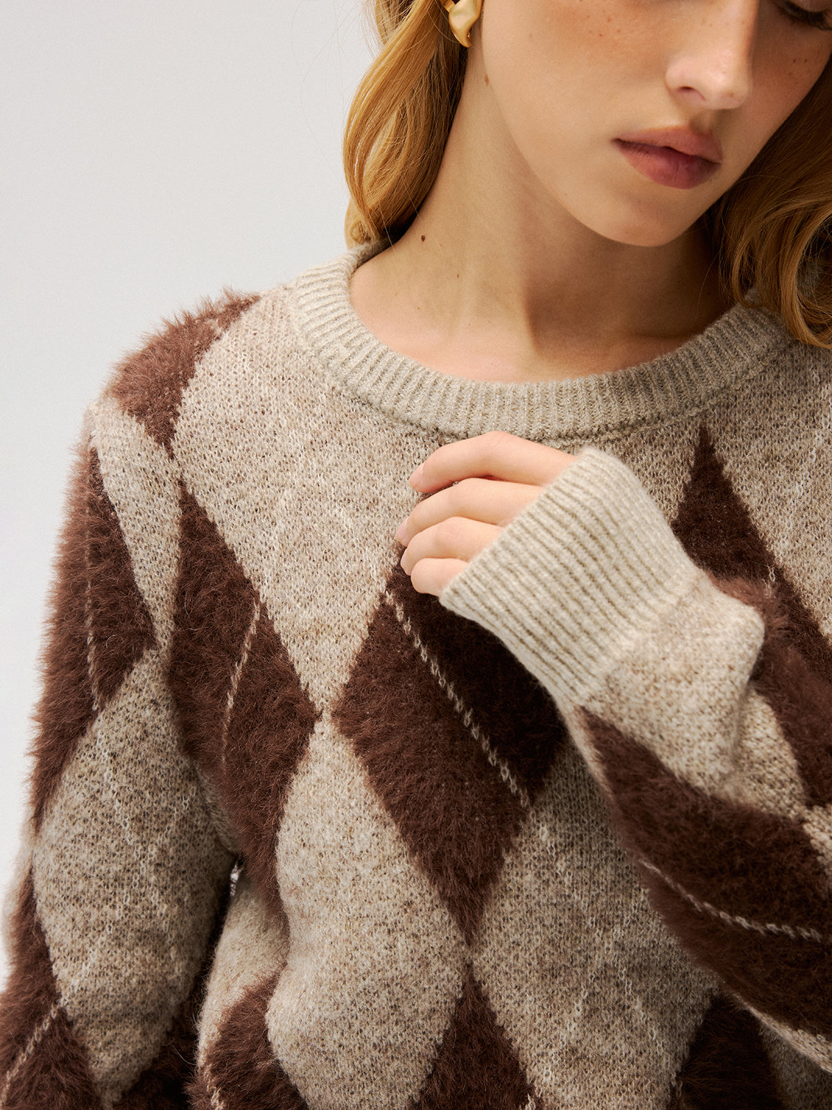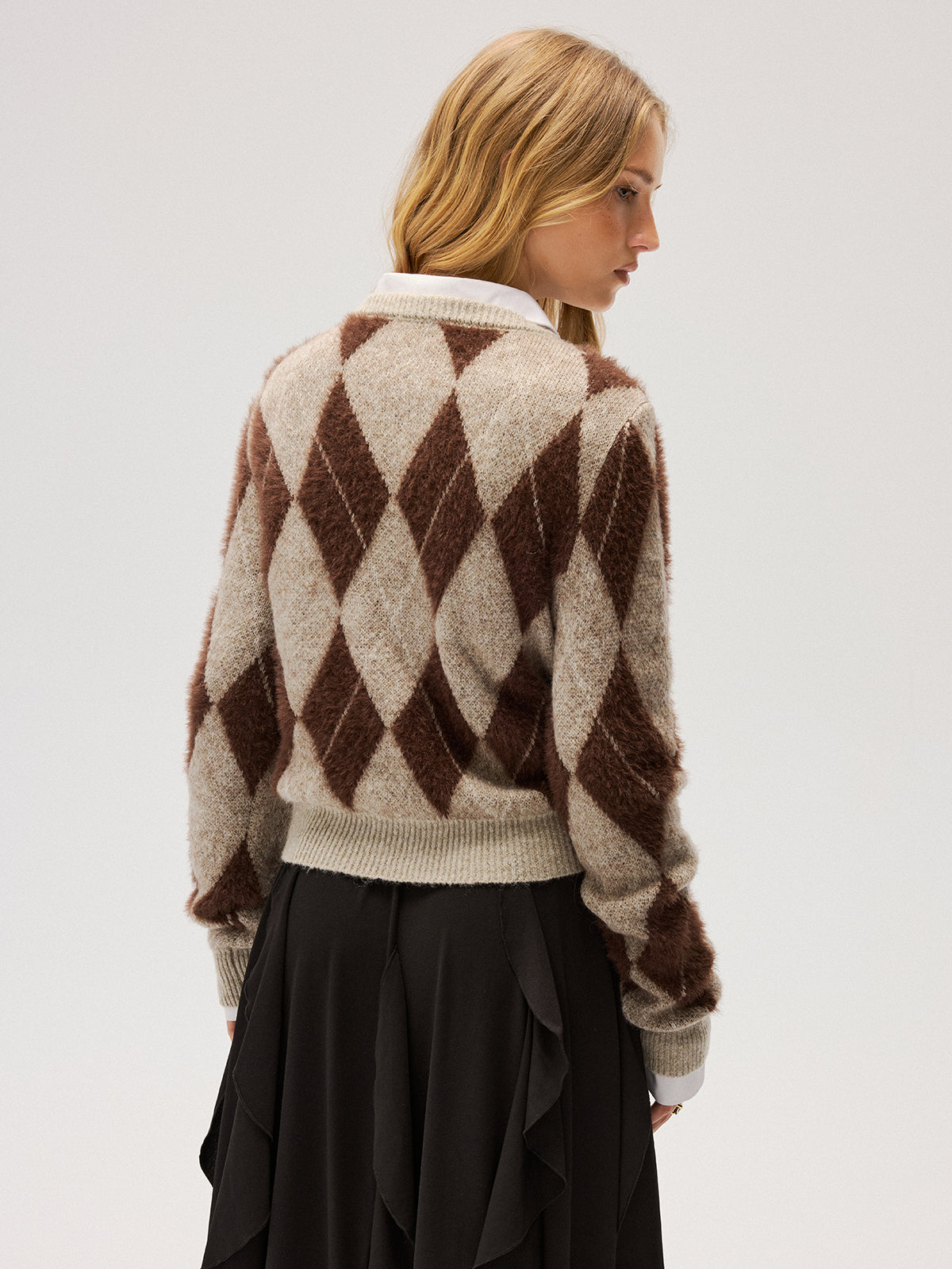 Argyle Pattern Wool Blend Fuzzy Sweater