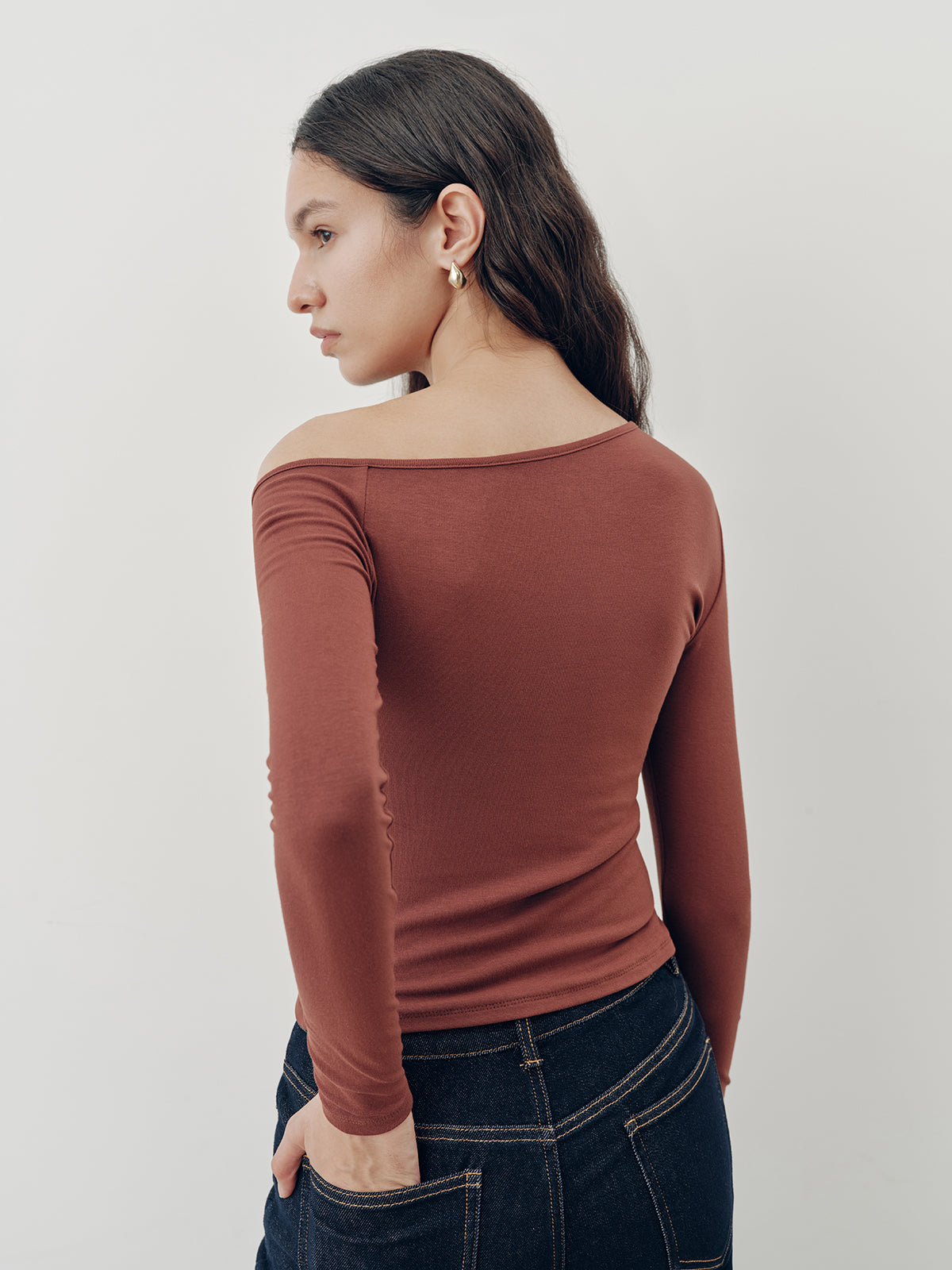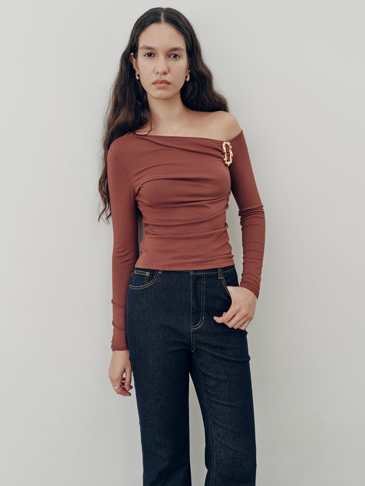 asymmetrical neck,blouses,casual,clothing,coll:blouses_shirts,coll:tops,corpcore,fall,in_six_month,inner sample,jersey,light brown,long sleeve,metal detail,minegence,no,not_low_sales,oa250905004,photo_model,regular,regular fit,slight stretch,spring,tops,winter,women